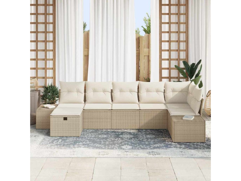 Tahle souprava zahradních pohovek se 7 díly dodá tvému venkovnímu prostoru elegantní šmrnc. Hladký béžový poly ratan a nadýchané krémové polštáře zvyšují pohodu na tvé terase a zajišťují pohodlné místo, kde se potkat s přáteli, odpočívat nebo pozorovat hvězdy.