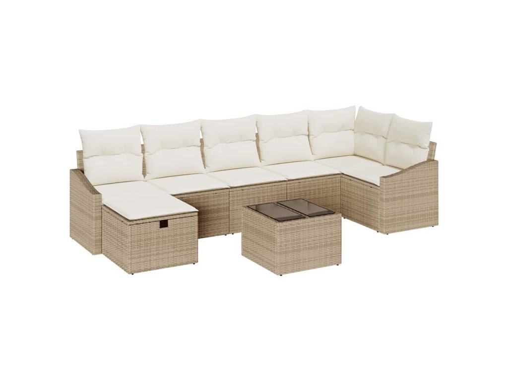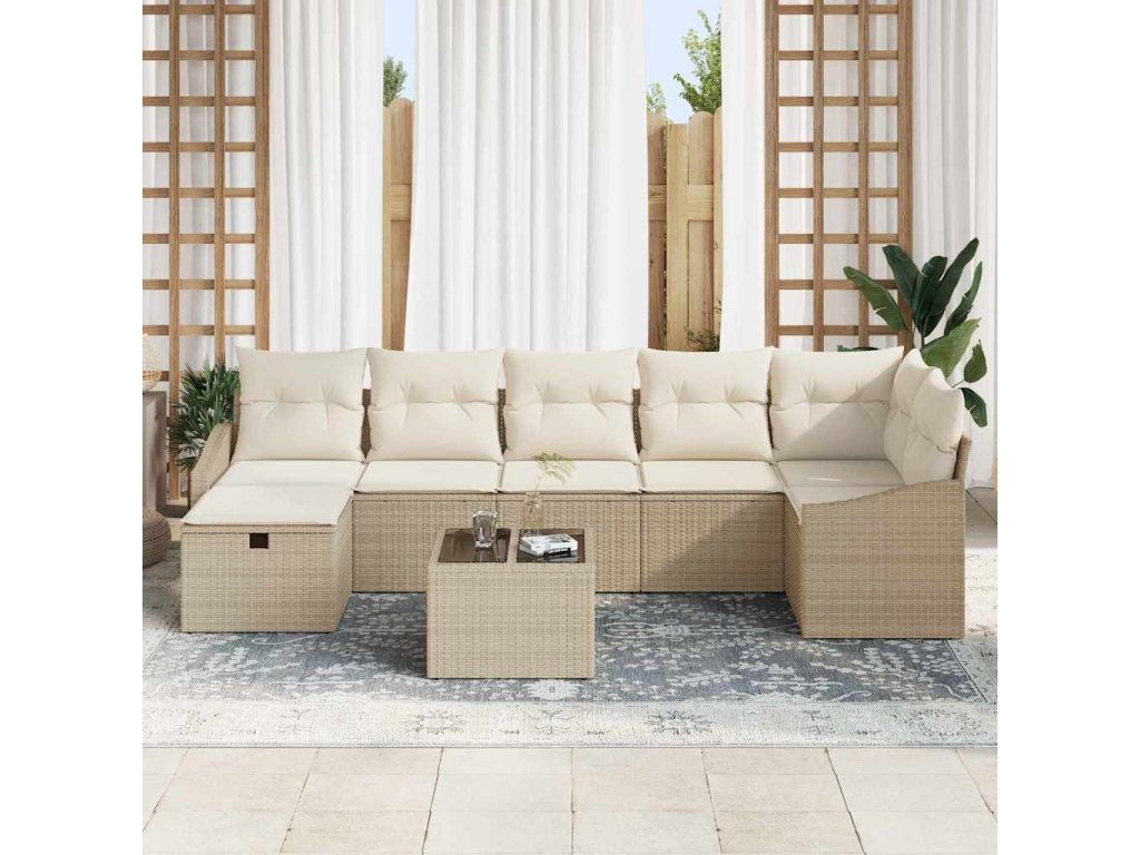 Tato sada zahradních pohovek skvěle kombinuje styl a funkci a poskytuje pohodlné sezení až pro osm lidí. Je ideální pro jakoukoli venkovní oblast. S elegantním béžovým vzhledem a měkkými bílými polštáři skutečně oživuje váš patio nebo balkon a dodává moderní nádech relaxaci venku.