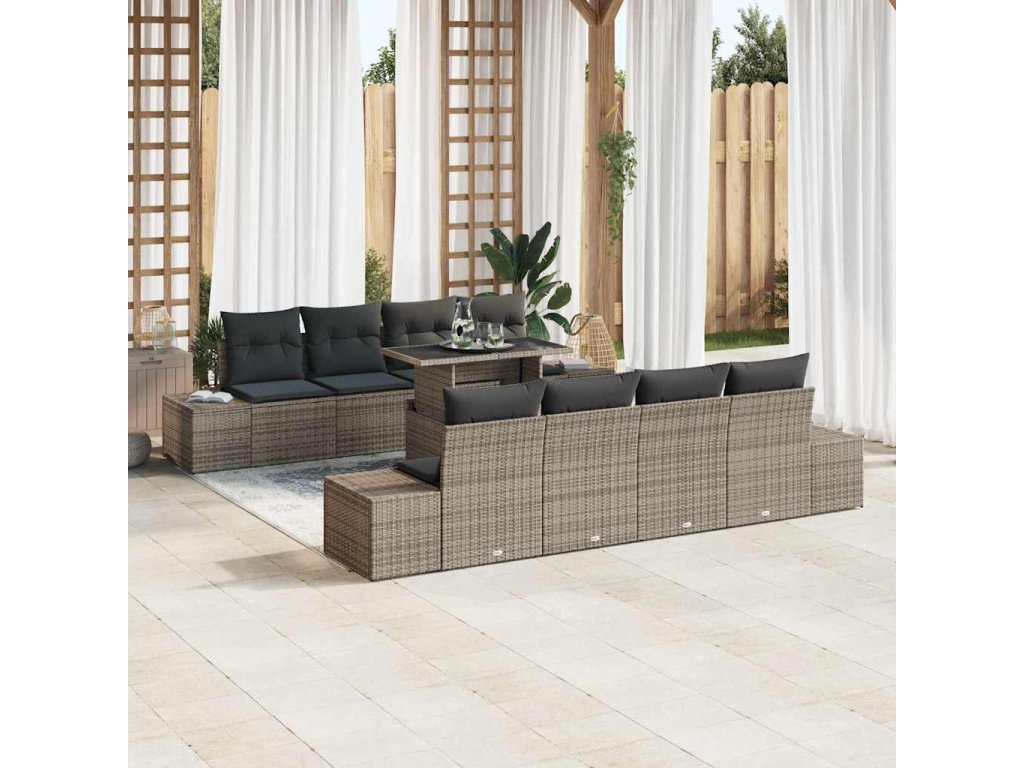 Tato sada zahradního nábytku má skvělý design pro venkovní odpočinek a zábavu, přidává styl a pohodlí na tvou terasu. Je vyrobena z kvalitního poly ratanu a polštářů, vytváří příjemnou atmosféru pro rodinu a přátele a zároveň se hodí k tvému zahradnímu stylu.