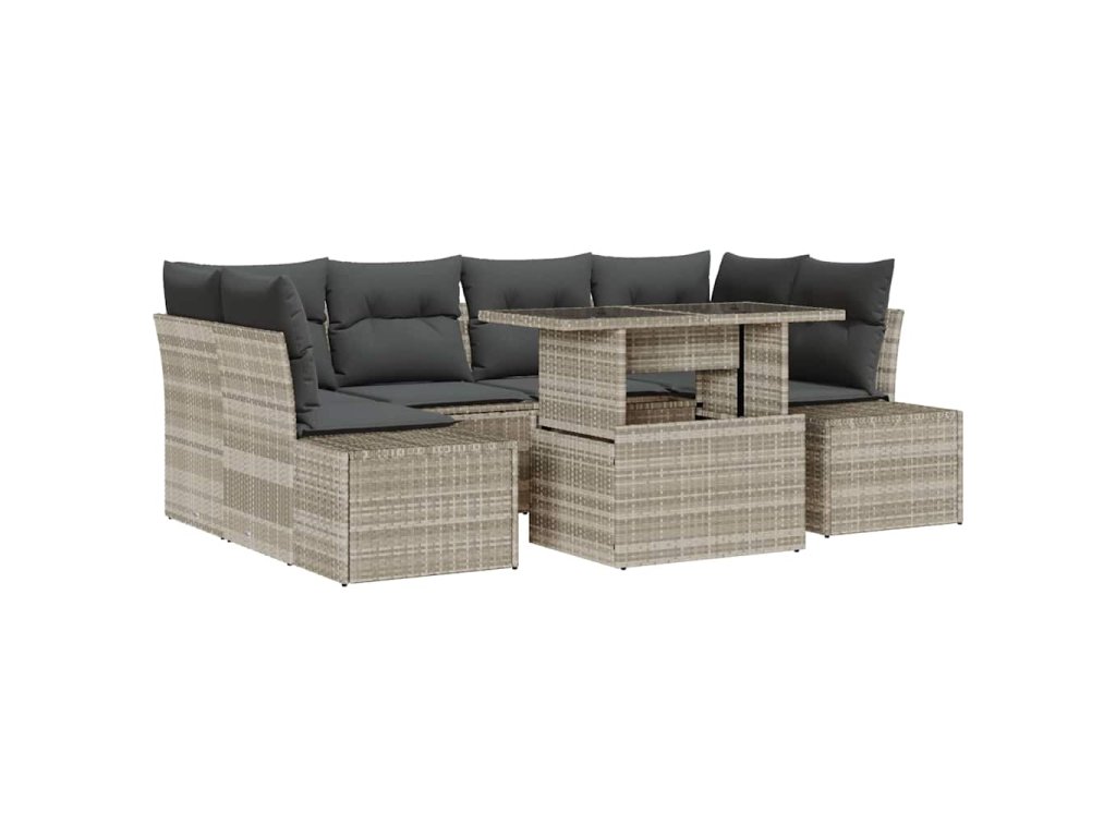 - Materiály: Zahradní pohovkový set je vyroben z vysoce kvalitního polyratanu, známého svou odolností a UV odporu. Tento materiál zajišťuje, že set odolává výzvám venkovního použití a zachovává si svůj vzhled a integritu po celé sezony.