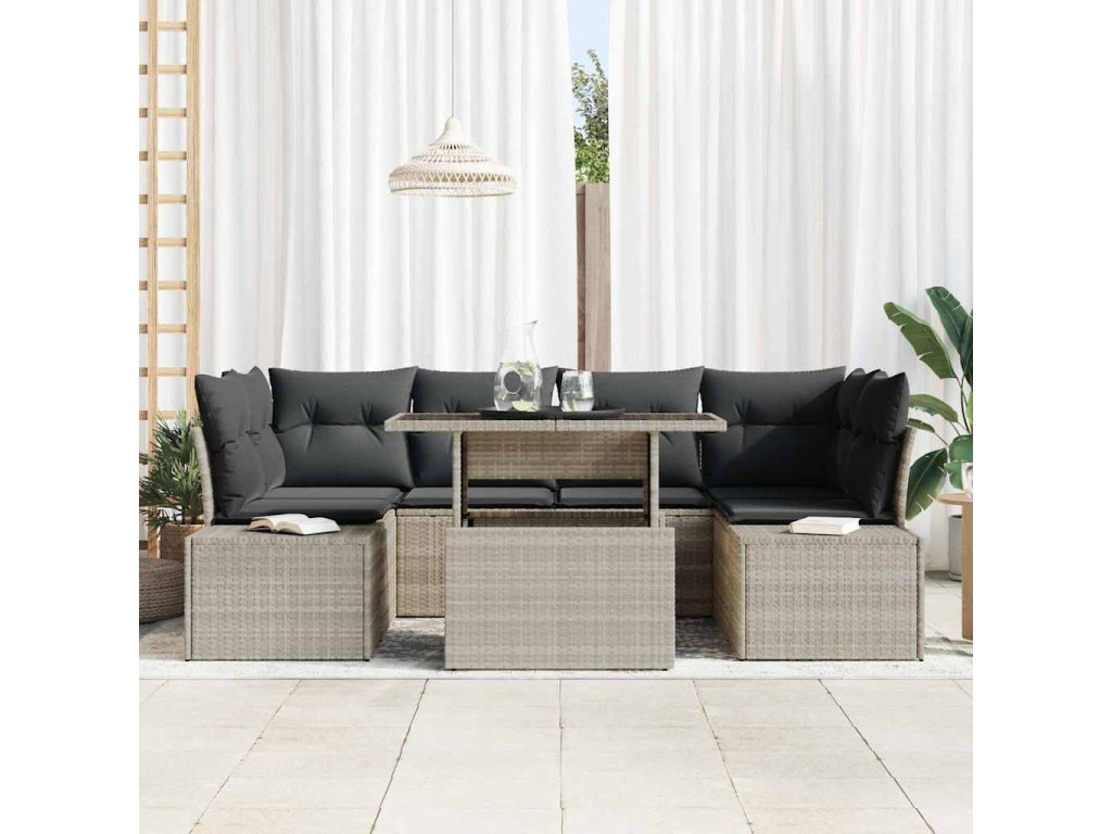 - Součásti: Tento set obsahuje 2 rohové sedadla, 2 středová sedadla, 2 boční pohovky a stůl s průhledným skleněným povrchem. Dále obsahuje polštáře odolné vůči povětrnostním vlivům pro zvýšení pohodlí sezení, což z něj činí ideální volbu jak pro společenské události, tak pro klidnou relaxaci.