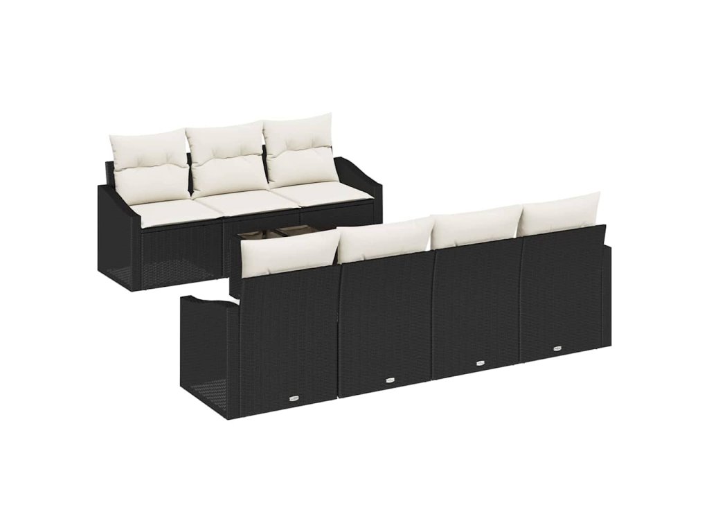 Tato zahradní pohovková souprava zlepší tvůj venkovní prostor svým stylovým vzhledem, ideálním pro balkony, terasy nebo zahradní odpočinkové plochy. Elegantní černý ratan spolu s pohodlnými béžovými polštáři vytváří útulnou atmosféru, ideální pro relaxaci nebo společné večeře.