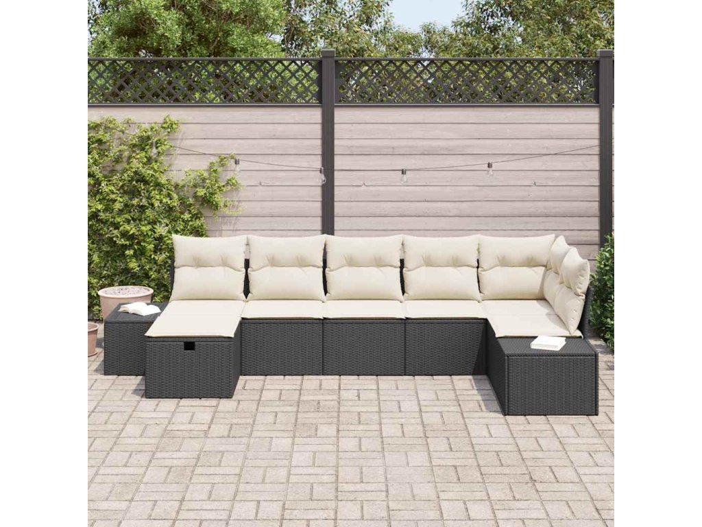 Tahle 7dílná sada zahradní pohovky je stylové venkovní sezení, co skvěle oživí tvou terasu. S trendy černým poly ratanem a měkkými krémovými polštáři nejen zlepší venkovní atmosféru, ale i ti poskytne pohodlné místo na pokec, relaxaci nebo užívání si večerního slunce.