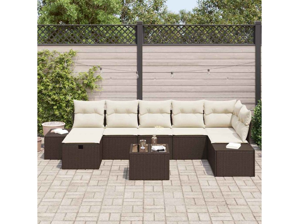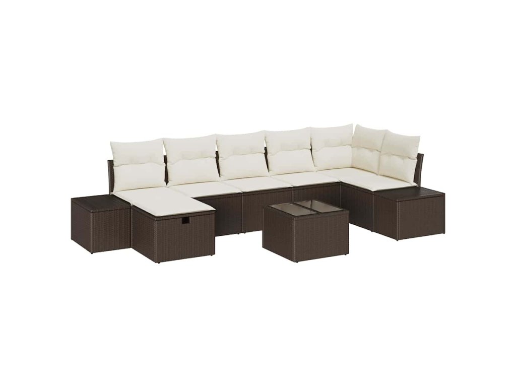 Tento 8dílný zahradní sofa set dodává elegantní dotek tvému venkovnímu prostoru, ideální pro odpočinek a společenské aktivity. Moderní vzhled hnědého poly ratanu spolu s pohodlnými krémovými polštáři nabízí skvélé pohodlí a parádně vypadá na tvém balkoně, patio nebo zahradě.