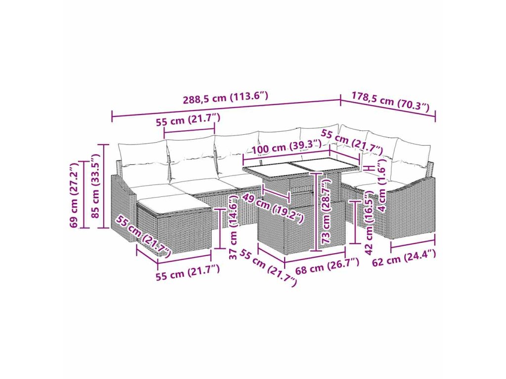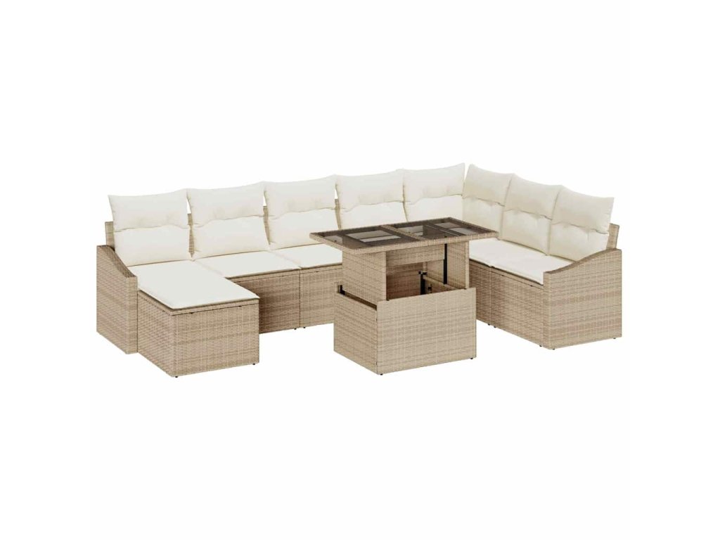 - Funkce / Design: Vybaveno UV-odolnými materiály, sofa set odolává slunečnímu záření, přidávajícímu trvalou hodnotu pro terasy a zahrady. Odnímatelné a vyměnitelné polštáře zvyšují praktičnost, což umožňuje snadnou údržbu a přizpůsobení.