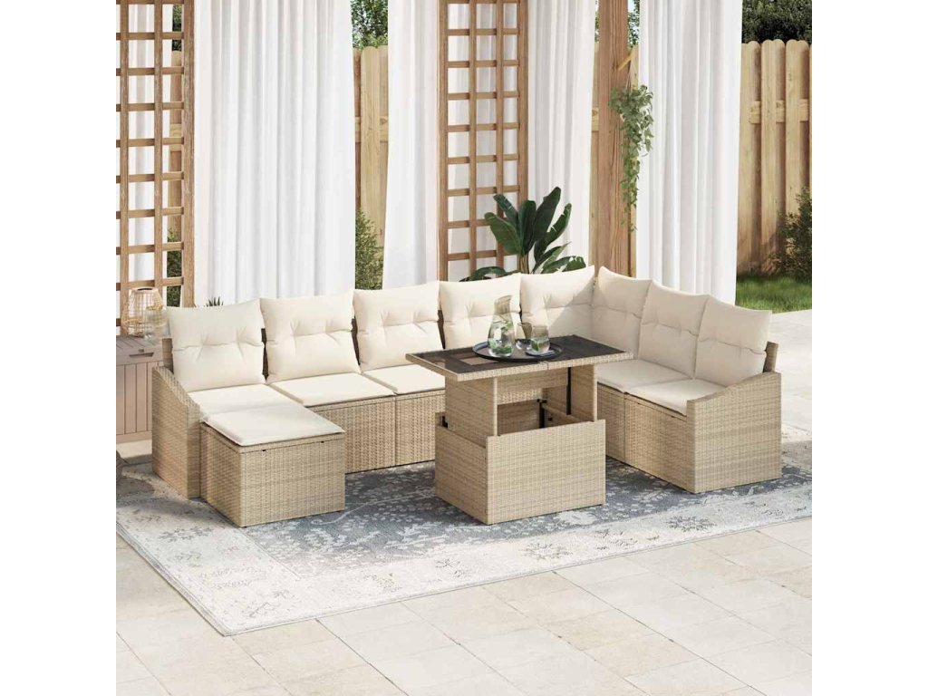 Tato sada zahradního sofa s polštáři z polyratanu je ztělesněním moderní jednoduchosti a funkčnosti, navrhovaná k zlepšení zahradních a terasových prostor. Má čisté linie a minimální ozdobné prvky, nabízí všestrannou možnost sezení, která dokonale vyvažuje estetickou přitažlivost a užitečnost. Uživatelé si mohou užívat její rafinovaný vzhled a zároveň ocenit vítanou atmosféru, kterou přináší každé venkovní setkání.