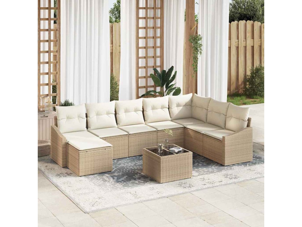 Tato 9dílná venkovní rohová pohovková souprava je zaměřená na styl a praktičnost, perfektní pro parádní lenošení venku. Moderní béžový poly ratan vypadá skvěle a měkké krémové polštáře zajišťují pohodlí při trávení času s přáteli a rodinou, ať už je slunečno nebo chladněji.
