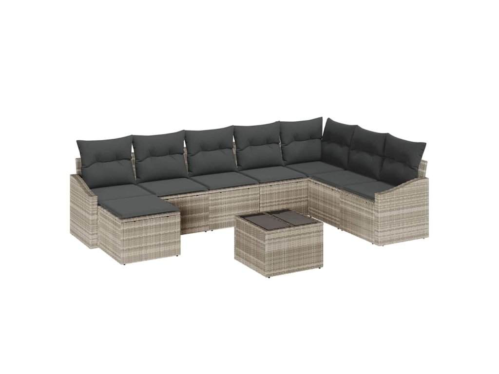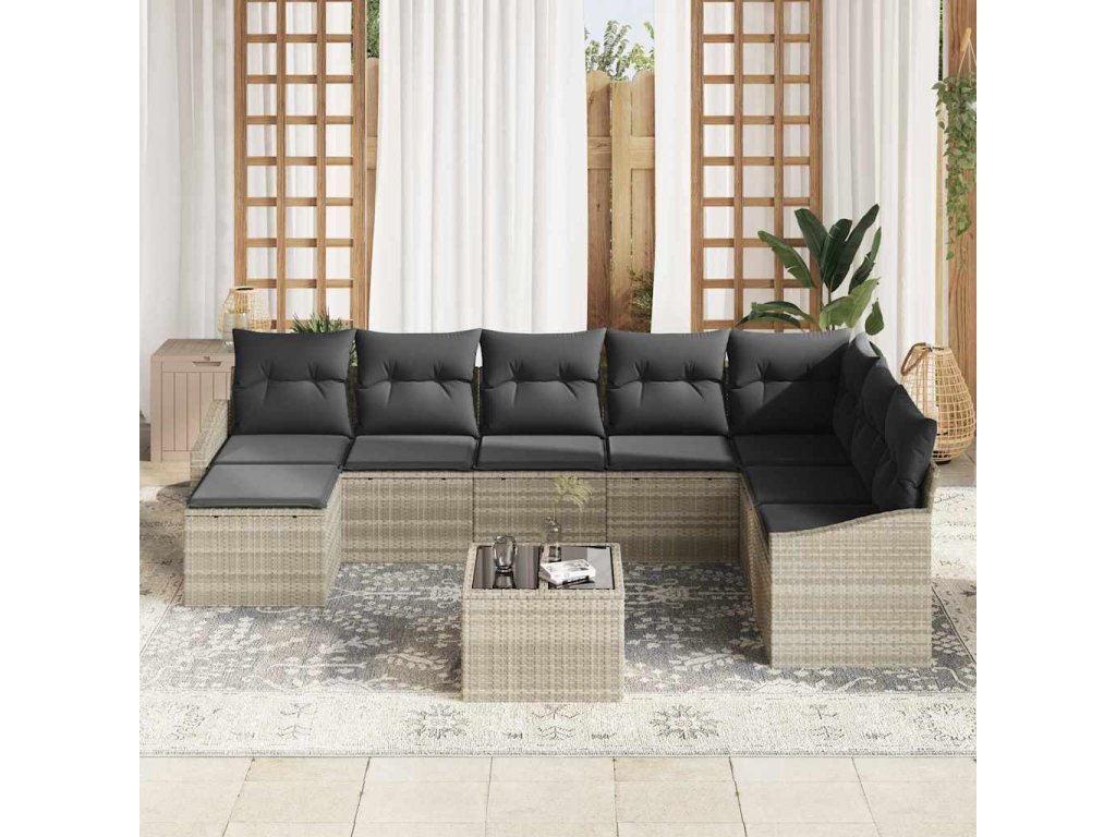 Tato 9dílná venkovní rohová pohovka je ideální mix stylu a praktičnosti, navržená tak, aby vytvořila rezinační místo venku. Moderní poly ratan a měkké šedé polštáře nejen vypadají dobře, ale taky ti poskytují pohodlné místo pro slunečné odpočívání nebo večerní pohovor.