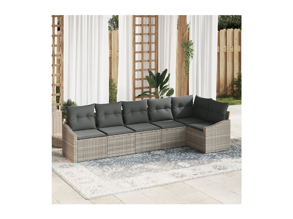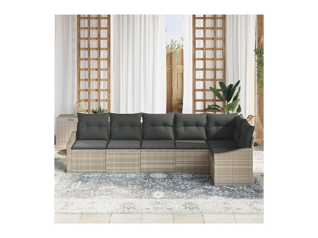 Tenhle 6dílný modulární zahradní pohovkový set přidává stylový prvek do tvého venkovního prostoru, spojující pohodlí s hezkým vzhledem pro každou zahradu nebo terasu. Měkká šedá látka a pevný poly ratanový základ tvoří příjemné místo pro pohodlné povídání a lenošení venku.