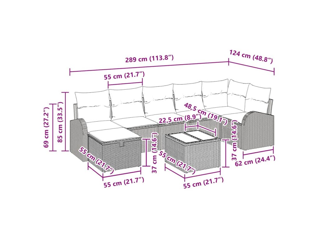 Tato zahradní pohovková sada spojuje styl a pohodlí, ideální pro relaxaci venku, ať už na patiu, balkonu, nebo v zahradě. S mnoha možnostmi sezení bez problémů obslouží větší skupiny, takže se hodí na společenské akce s přáteli nebo rodinou při užívání čerstvého vzduchu.