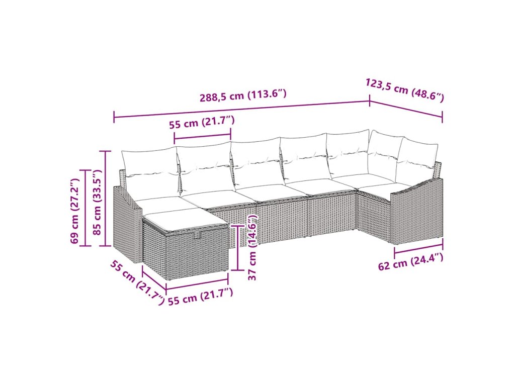 • Prostorné sezení: Místo pro až 7 osob je ideální pro lenošení na shromážděních, BBQ nebo prostě užívání slunce. • Nepromokavá látka: Z kvalitních, voděodolných materiálů, tento venkovní nábytek dává smysl, aby vydržel počasí. • Praktické úložné prostory: Pohovka má úložné sekce na polštáře a venkovní nezbytnosti, tedy zlepšuje celkový vzhled. • Stylový design: Moderní styl s hnědo-krémovou kombinací se hodí ke každé venkovní výzdobě, přináší trendy atmosféru. • Snadná údržba: Jednoduchá na čištění, materiály pomáhají udržet pohovky vypadat skvěle po celý rok.- Počet položek: 7