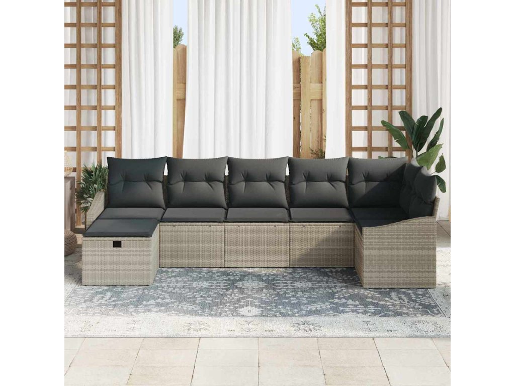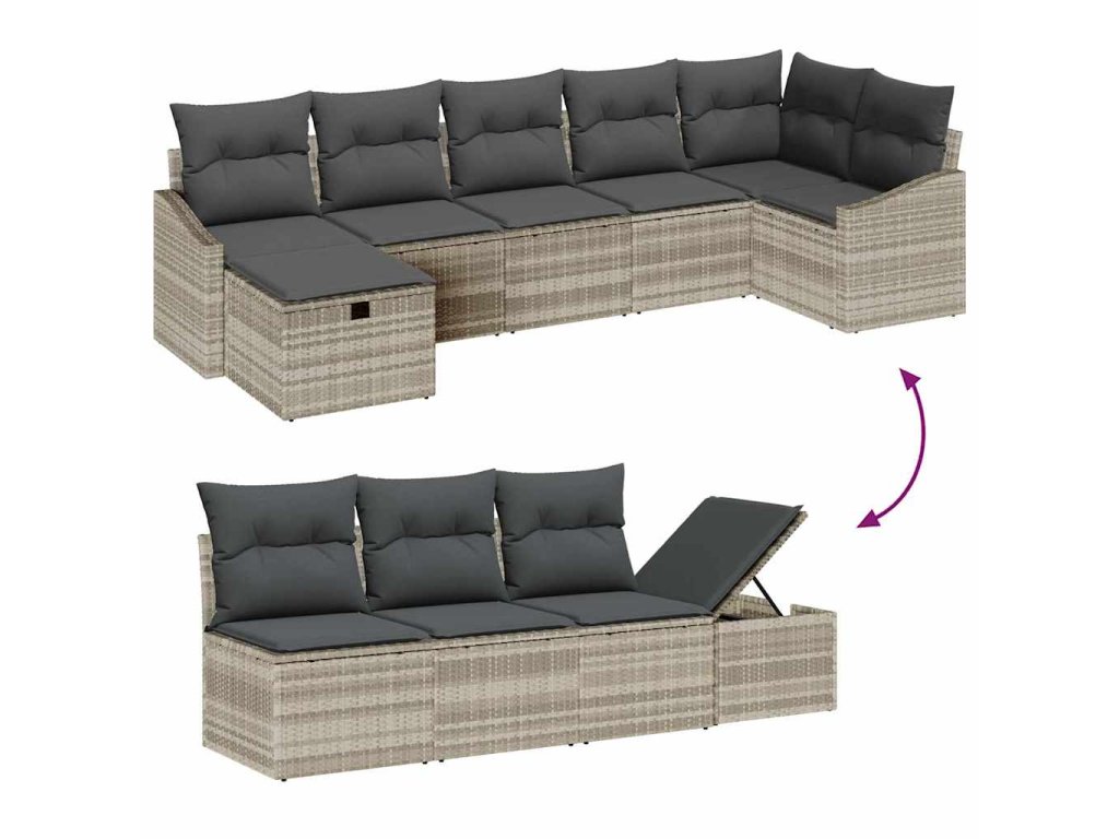Tato sada venkovních pohovek je skvělým středem vašeho patia, balkónu nebo zahrady. Spojuje eleganci s praktičností - má obdélníkový tvar, šedou texturu z poly-ratanu a pohodlné šedé polštáře, které vás zvou k relaxaci. Ideální pro posezení s přáteli nebo klidný večer.
