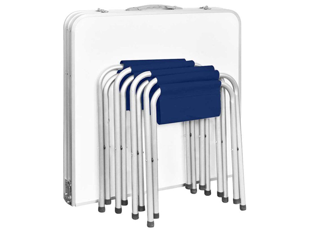 Kempingový jídelní set je lehký. Můžete ho snadno přenášet kamkoliv s sebou za praktickou rukojeť, ať už se chystáte na piknik nebo na výlet. Výšku stolu je možné nastavit na 55 cm, 62 cm a 70 cm. Kempingový stůl má robustní konstrukci a nosnost až 30–50 kg. Kovový rám a robustní stolní deska z MDF mu přidávají na stabilitě a odolnosti.