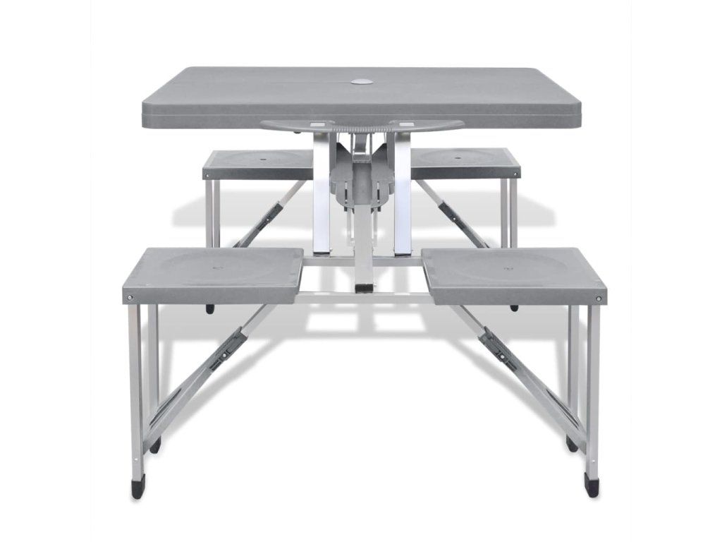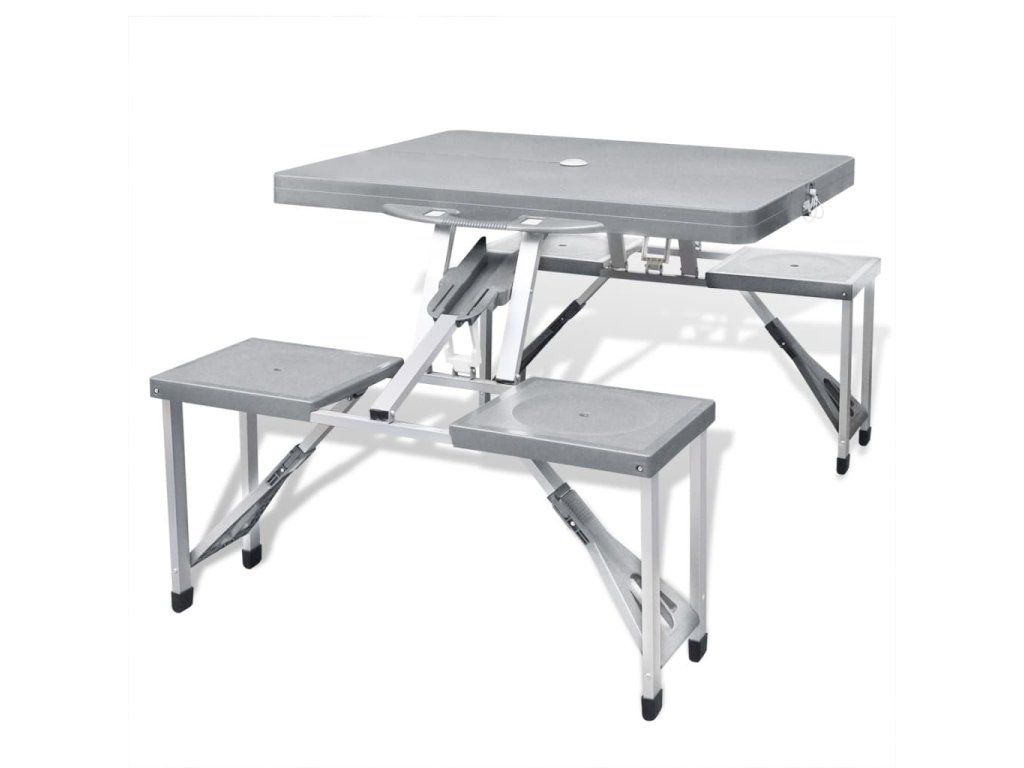 Tato kempingová sada má nízkou hmotnost. Díky transportní rukojeti ji můžete snadno vzít s sebou, když se vydáte na piknik nebo když jedete kempovat. Protože má robustní strukturu, unese tento kempingový stůl až 30 kg. Díky svému kovovému rámu a robustní stolní descea a stoličkám z PP, je celý set velmi stabilní a odolný. Uprostřed stolní desky je otvor na slunečník, takže do něj můžete zastrčit slunečník, a zůstat tak v chládku a ve stínu.