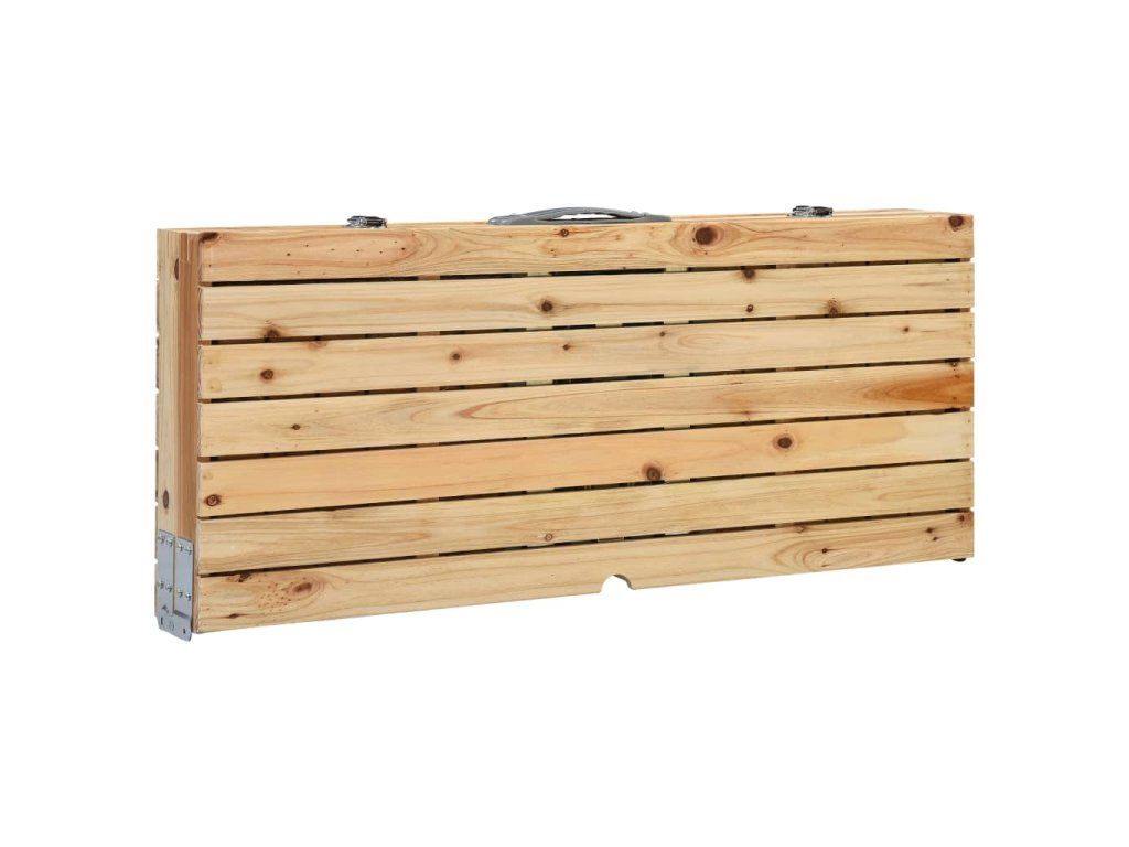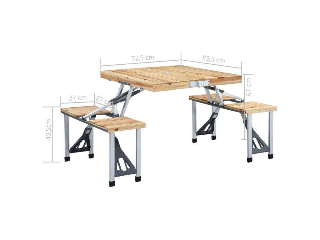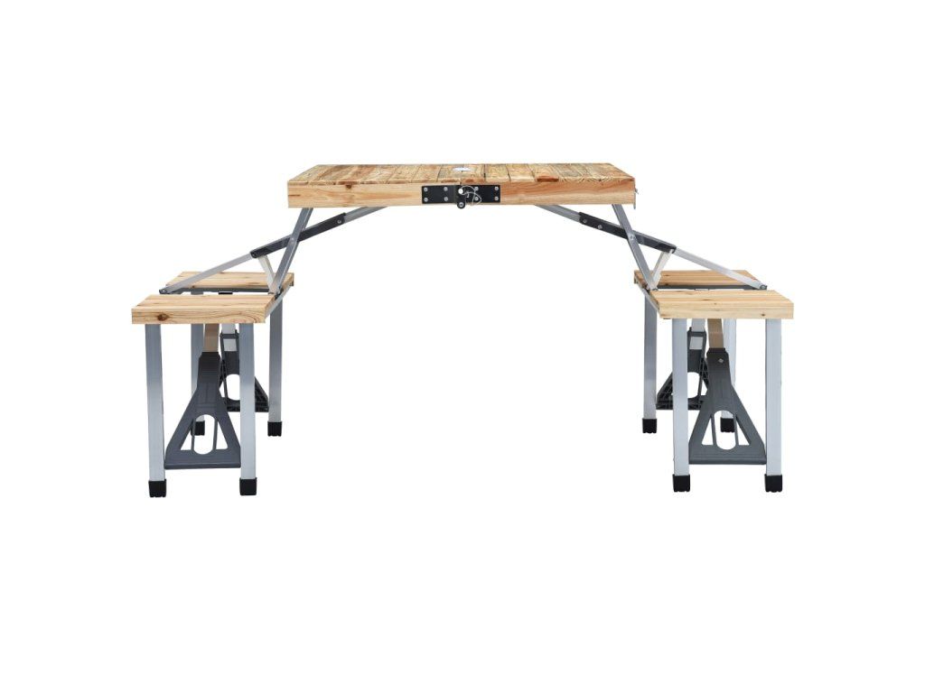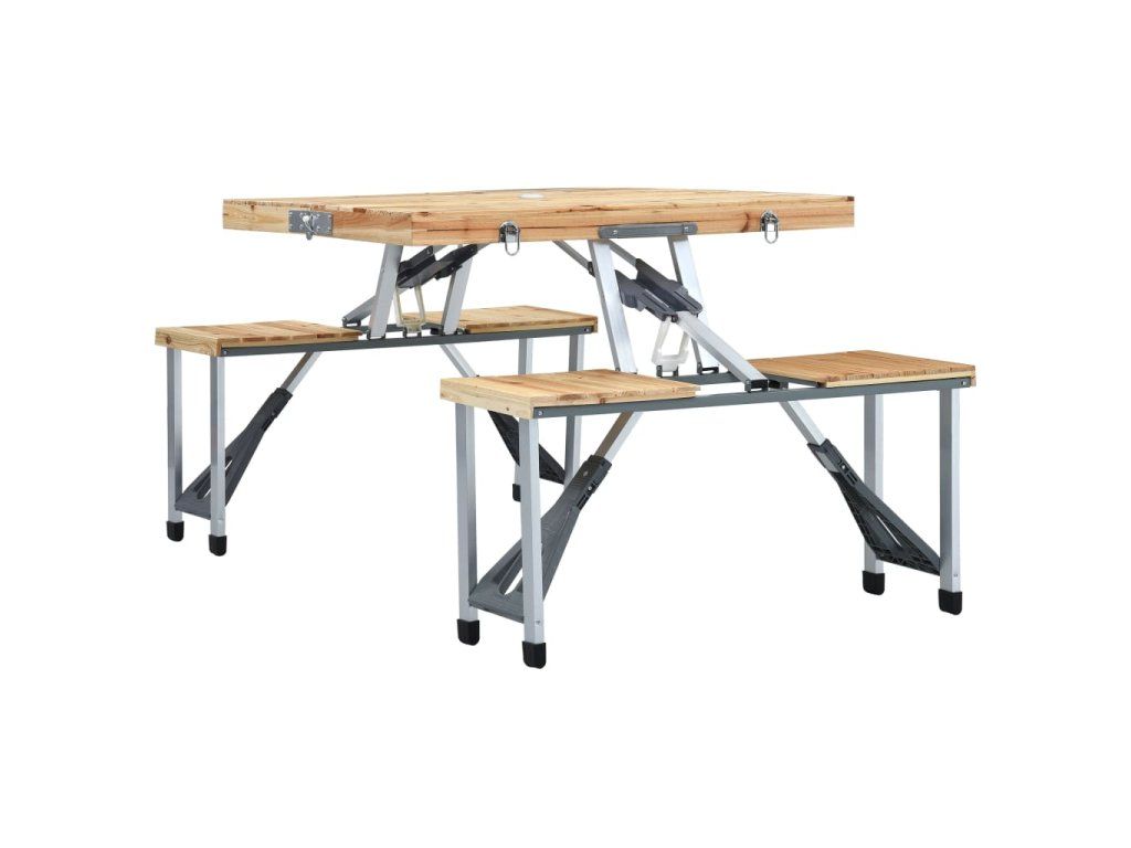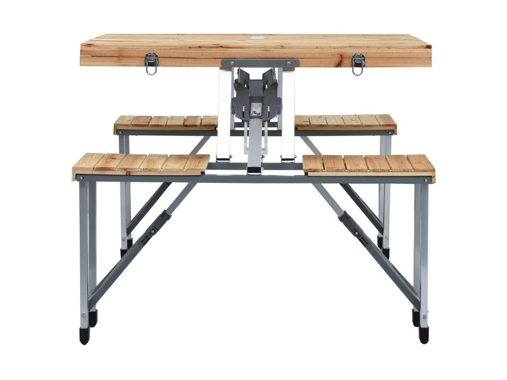 Stolní deska z jedlového dřeva zapůsobí svým přírodním šarmem a o trvanlivost a robustnost stolku se postará prvotřídní ocelový a hliníkový rám. Kempingový stůl s lavičkami má praktický skládací design, a proto ho lze bez snadno složit do pouzdra a bez námahy přenášet. Stejně tak ho můžete rychle uložit, když se právě nepoužívá. Otvor pro slunečník ve stolní desce umožňuje pohodlnou instalaci slunečníku.