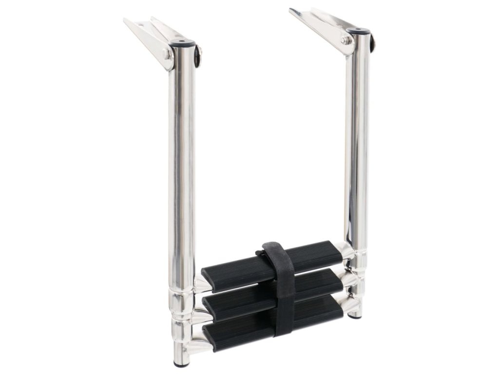 Unikátní teleskopický design umožňuje snadné a rychlé rozložení žebříku pro bezpečně nalodění. Každý schůdek je pro maximální bezpečí opatřený protiskluzovým dezénem. Nástupní žebřík ze silné nerezové oceli nabízí dlouhodobou životnost a unese až 200 kg. Pokud schůdky právě nepoužíváte, můžete je upevnit popruhem. Montážní příslušenství je součástí balení.
