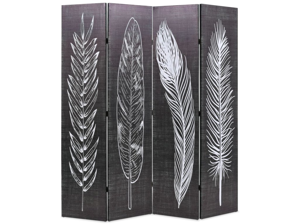 Paraván má masivní dřevěný rám a je pokryt odolným plátnem, který má na obou stranách sofistikovaný potisk na motiv pírek. Do vašeho pokoje vnese zajímavý styl a dekor. Paraván lze také snadno složit pro úsporné skladování, když ho právě nepoužíváte.