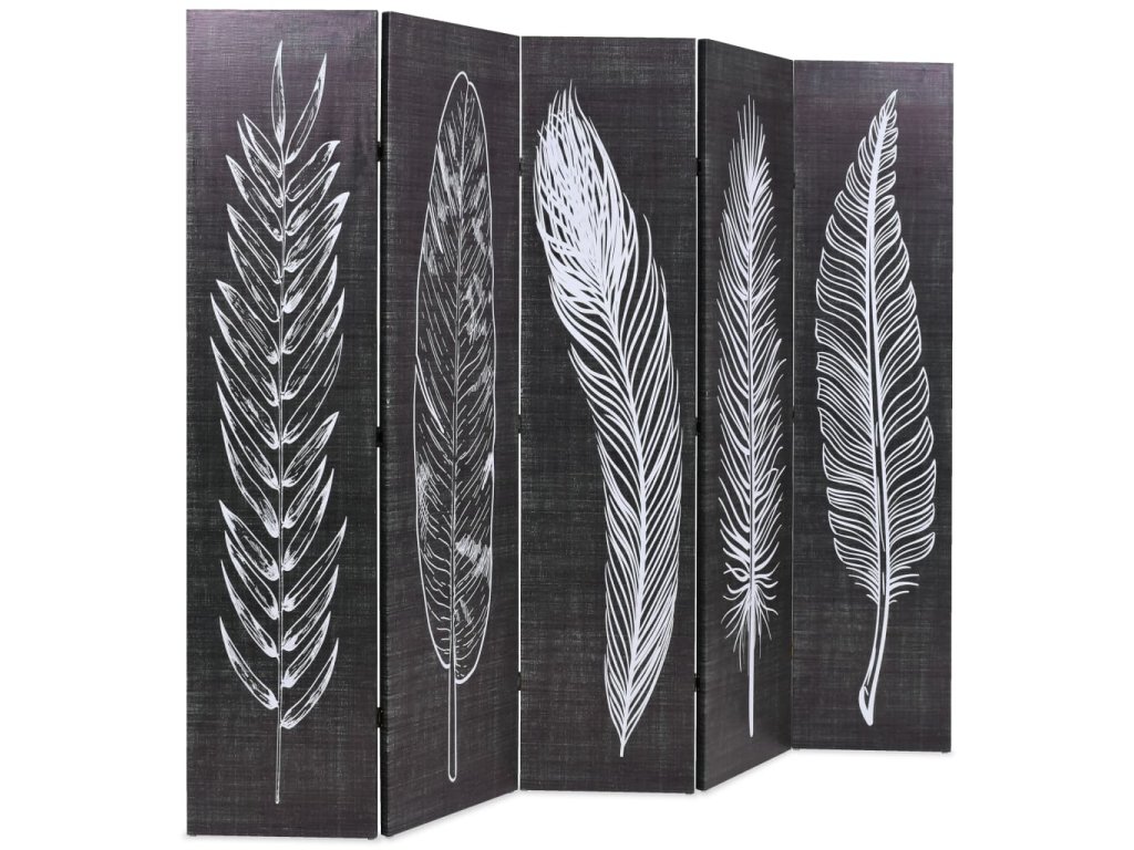 Paraván má masivní dřevěný rám a je pokryt odolným plátnem, který má na obou stranách sofistikovaný potisk na motiv pírek. Do vašeho pokoje vnese zajímavý styl a dekor. Paraván lze také snadno složit pro úsporné skladování, když ho právě nepoužíváte.
