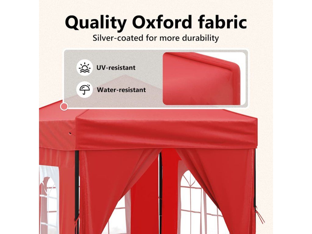 - Prémiový střešní materiál: Tento pavilon je vyroben z oxfordské tkaniny 210D se stříbrným povlakem a má UV a voděodolnost. Účinně blokuje škodlivé UV paprsky a odolává vlhkosti a dešti.