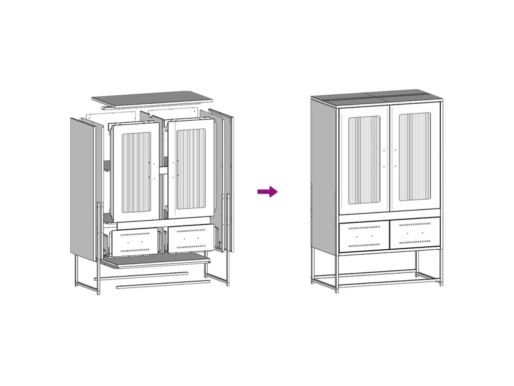 - Se 4 přihrádkami, 2 dvířky a 2 zásuvkami