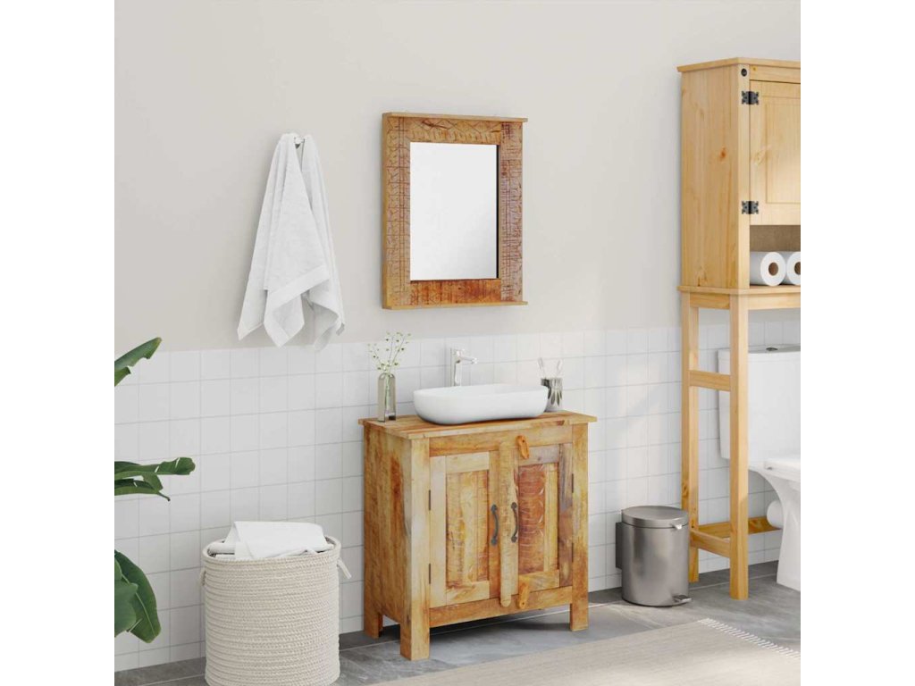 Skříňka pod umyvadlo a rám zrcadla jsou vyrobené z masivního mangovníkového dřeva, což činí tento koupelnový nábytek stabilní, pevný a odolný. Řemeslné zpracování a krásná struktura dřeva dává každému nábytku jedinečný a od všech ostatních odlišný charakter.