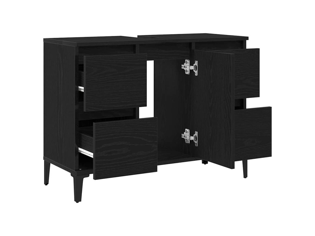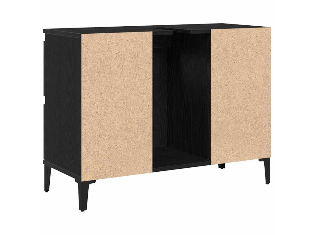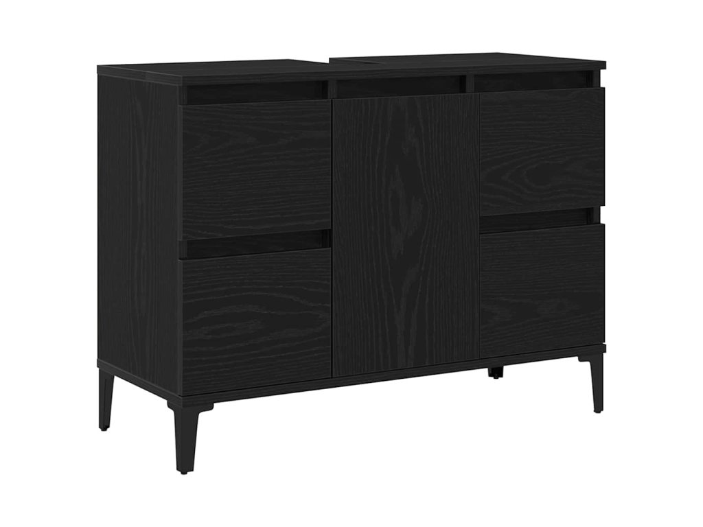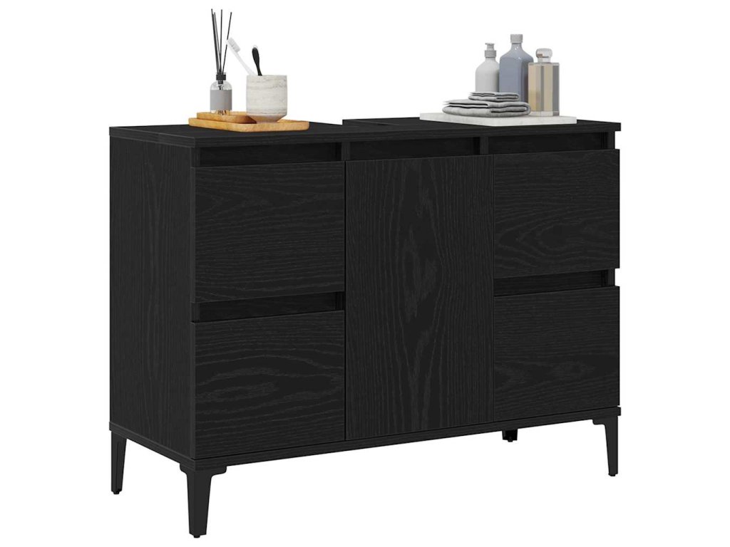 - Elegantní moderní vzhled: Obdélníkový tvar a kuželové nohy skříňky ideálně ztělesňují moderní design. Černé ocelové nohy kontrastují s dřevěným dekorem a dodávají eleganci, která se hodí k různým koupelnovým stylům. Její minimalistický design zajišťuje, že se skvěle vpíjí do moderních interiérů.
