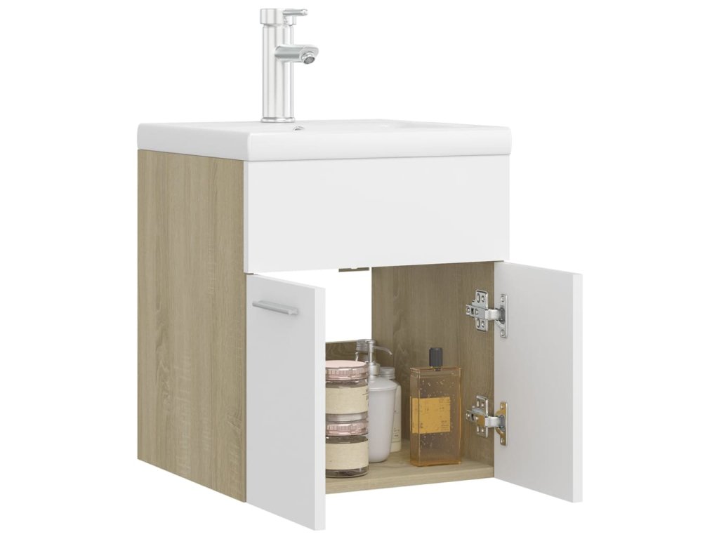 Skříňka je zhotovená z kompozitního dřeva, což jí zaručuje výtečnou stabilitu a pevnost. Za dvoukřídlými dvířky najdete 1 přihrádku, která vám poskytne spoustu místa k uložení vašich věcí. Dokonale padne pod umyvadlo a nabídne vám šikovné úložné řešení do koupelny. Keramické umyvadlo neslouží pouze jako hygienická nádoba pro každodenní použití – hraje také významnou dekorativní roli. Svým trendovým a moderním designem navíc krásně doplní každý styl zařízení. Součástí je i přepad, který umožňuje odtékání vody v případě, že se umyvadlo příliš přeplní. Glazovaný povrch mu dodává novodobý, elegantní vzhled. Skříňku i umyvadlo snadno očistíte navlhčeným hadříkem.