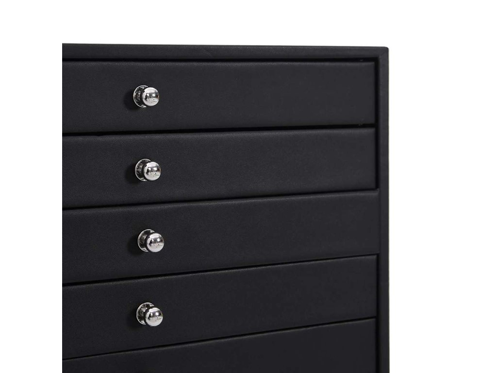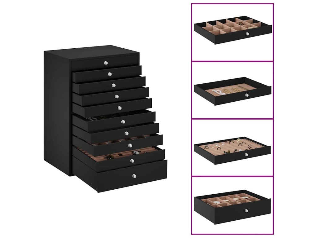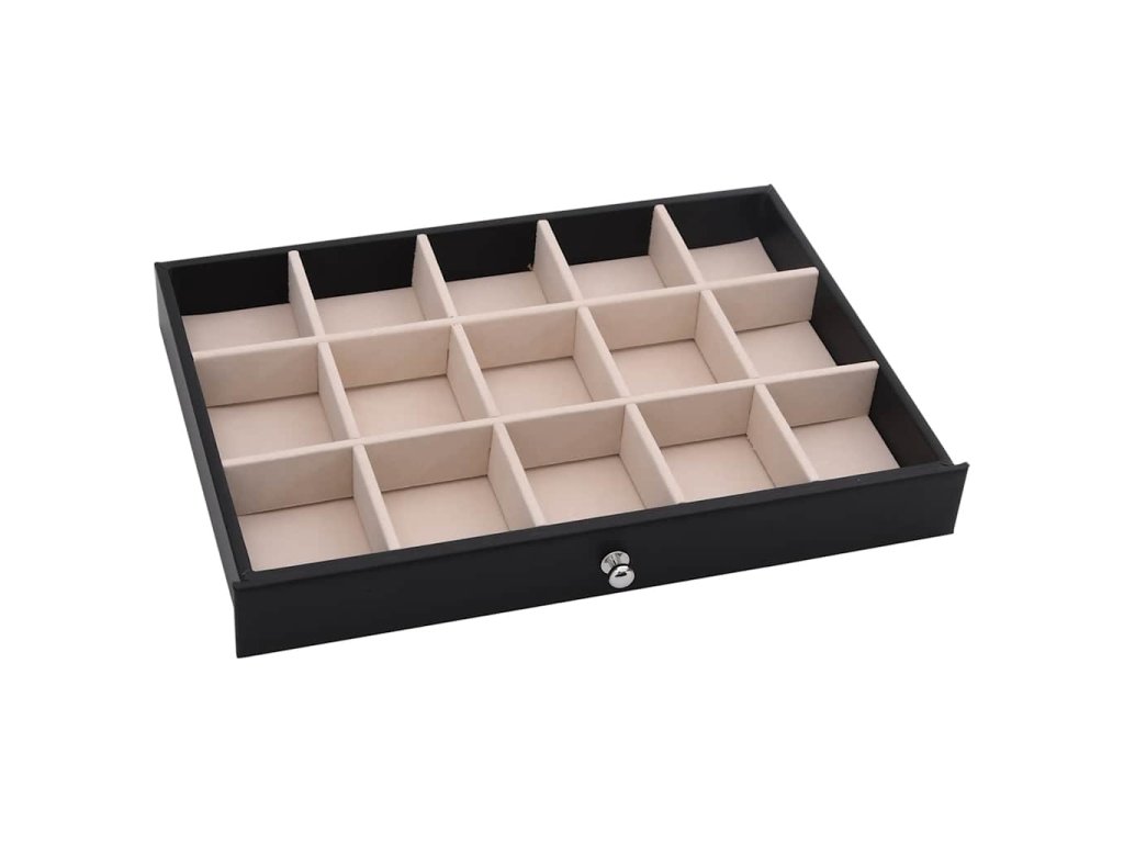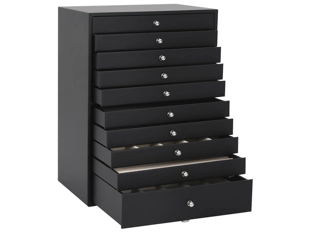 - Dostatek úložného prostoru: Šperkovnice má deset vrstev s více přihrádkami pro snadné uspořádání. Horní až sedmá vrstva nabízí prostorné zásuvky pro uložení šperků. Osmá vrstva obsahuje čtvercové přihrádky na náramky a náhrdelníky, zatímco devátá vrstva je určena pro prsteny a cvočky. Spodní vrstva obsahuje držáky na hodinky, díky kterým jsou všechny šperky uspořádané a přístupné.