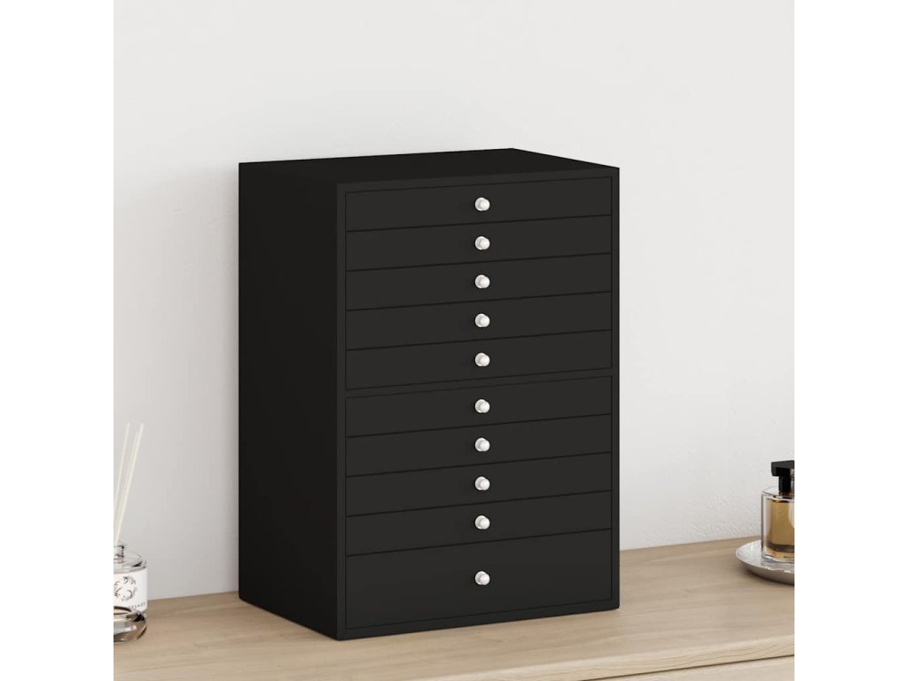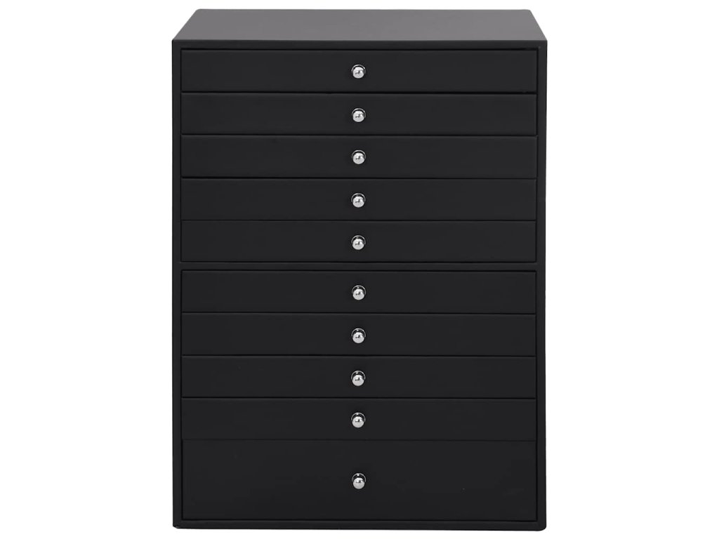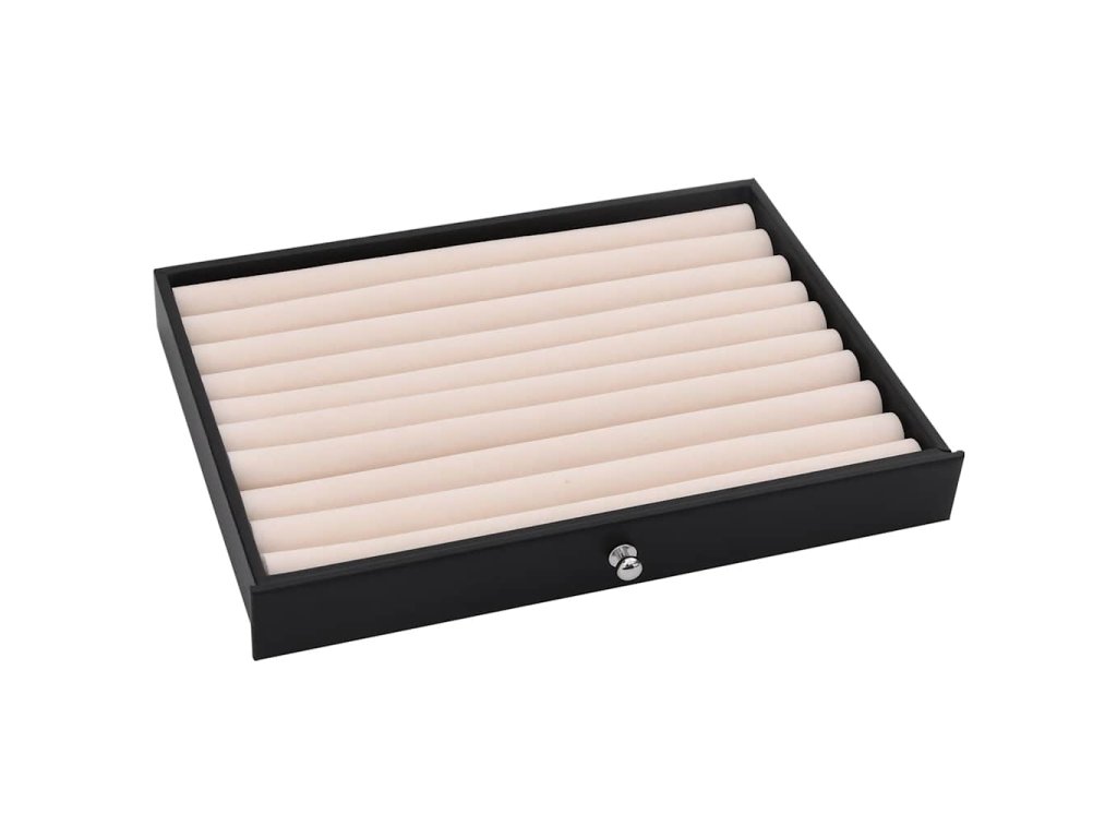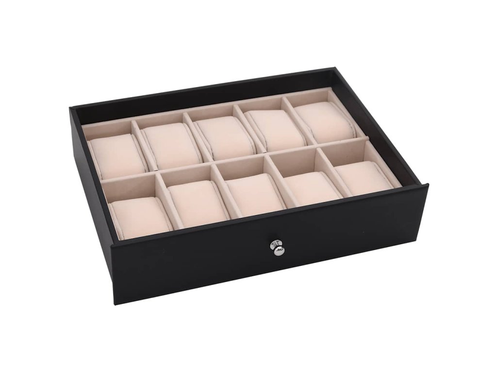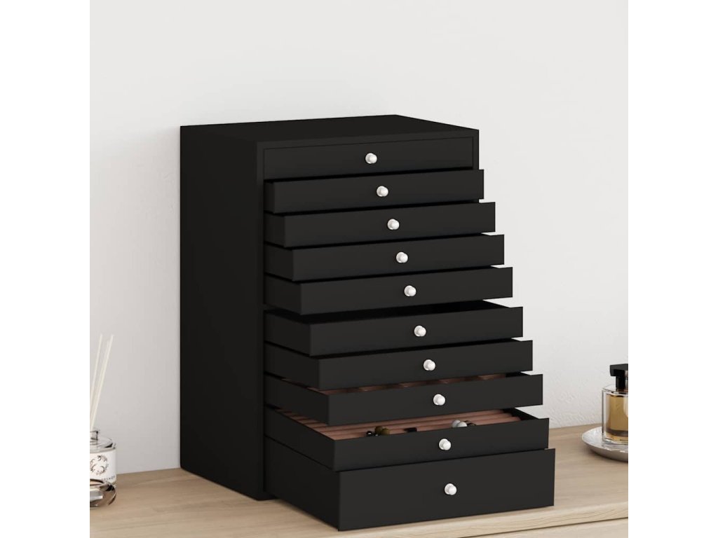 - Dostatek úložného prostoru: Šperkovnice má deset vrstev s více přihrádkami pro snadné uspořádání. Horní až sedmá vrstva nabízí prostorné zásuvky pro uložení šperků. Osmá vrstva obsahuje čtvercové přihrádky na náramky a náhrdelníky, zatímco devátá vrstva je určena pro prsteny a cvočky. Spodní vrstva obsahuje držáky na hodinky, díky kterým jsou všechny šperky uspořádané a přístupné.