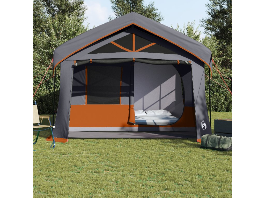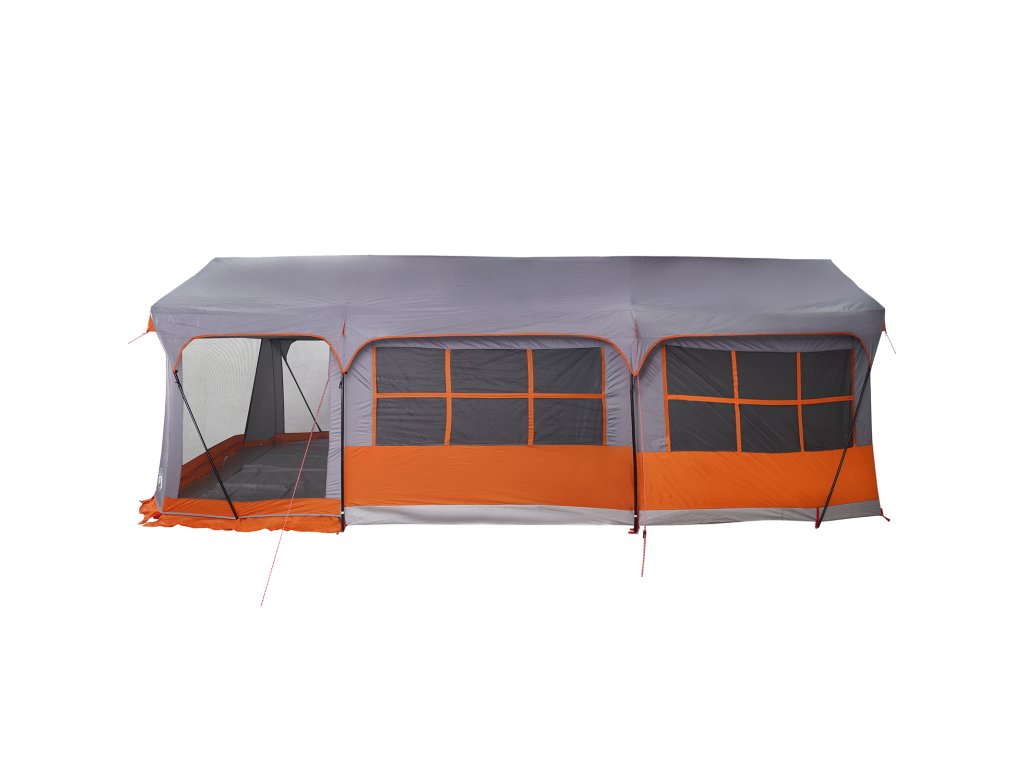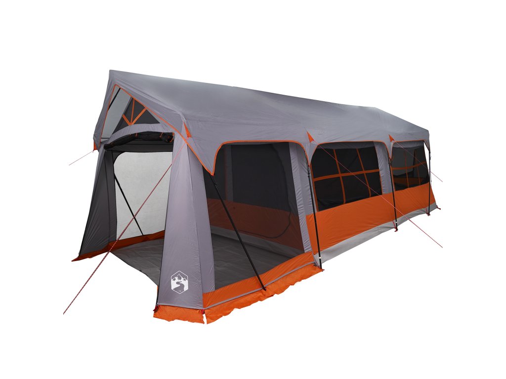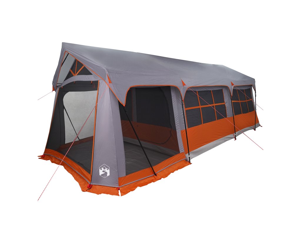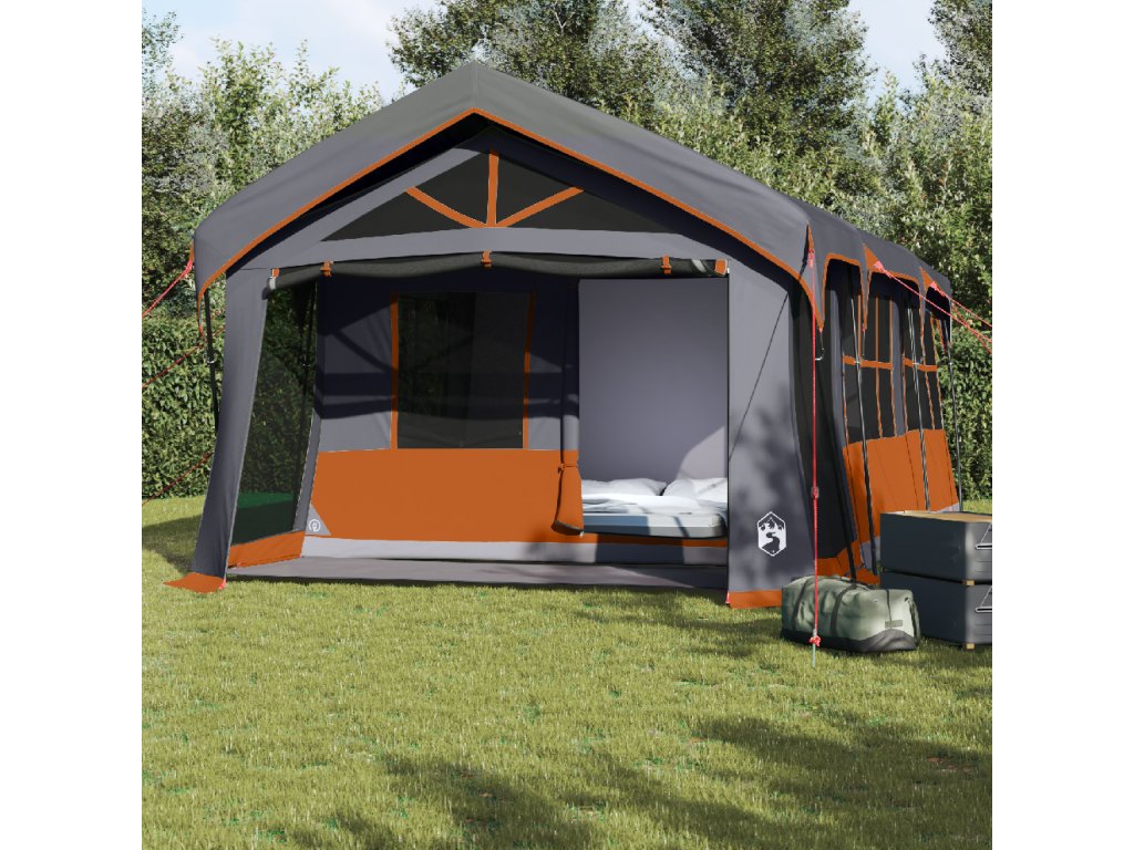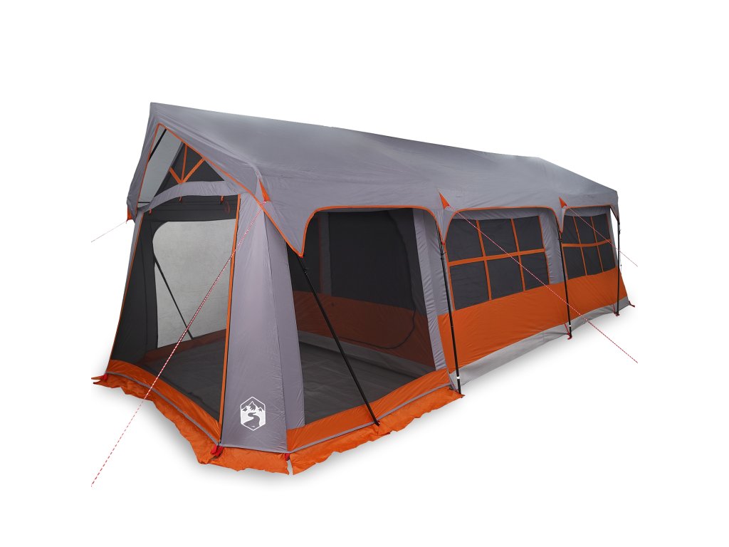 Tento velký kempovací stan nabízí skvělé místo, ideálně pro deset lidí. Moderní obdélníkový design v jasně šedé a oranžové barvě vypadá výborně a nabízí hodně prostoru pro odpočinek a trávení času s rodinou a kamarády na vašich výletech.