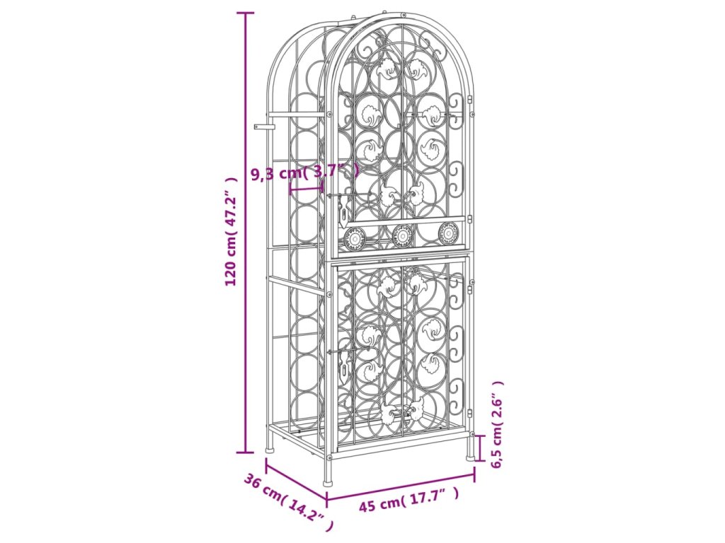 - Stabilní konstrukce: Tento držák na láhve vína je vyroben z robustního tepaného železa s povrchovou úpravou černým práškovým lakem, který odolává oxidaci a rzi. Přiložené nástěnné úchyty zabraňují kývání a naklánění stojanu, takže ho můžete používat celá léta.