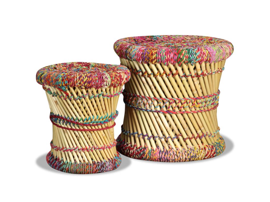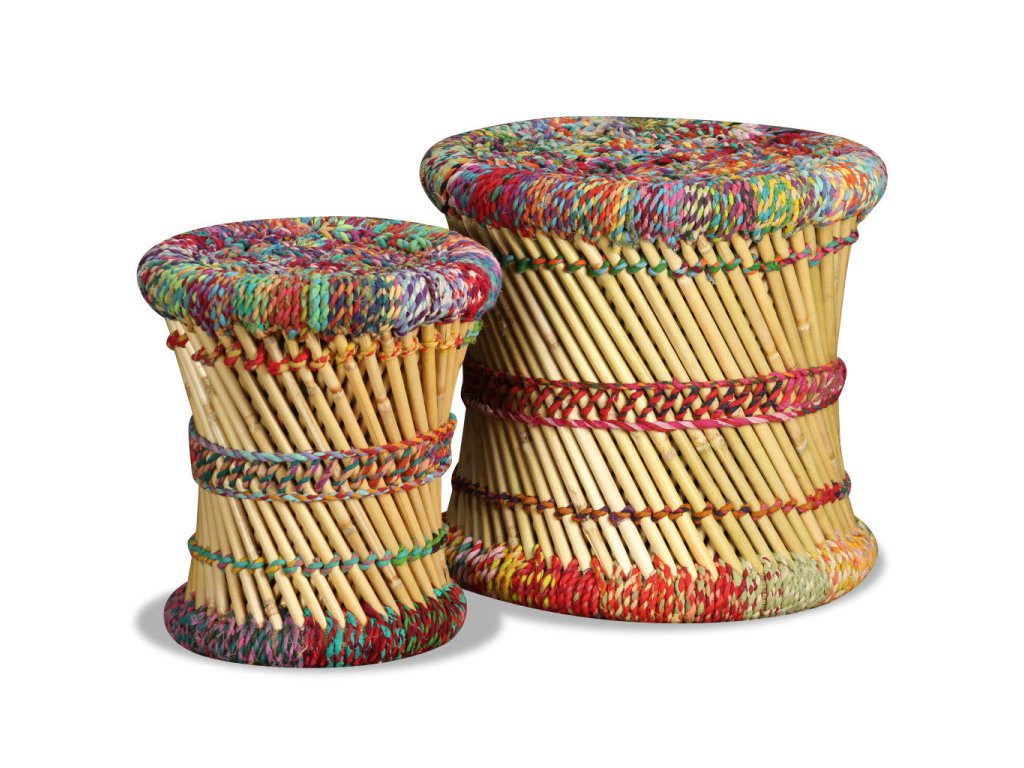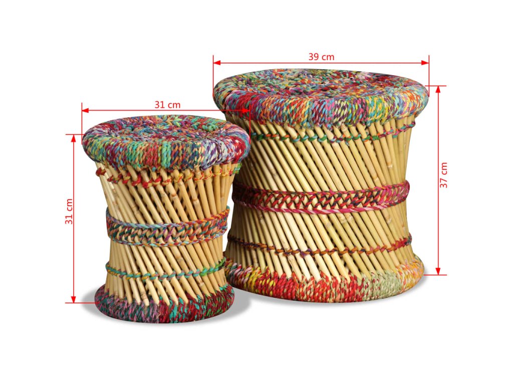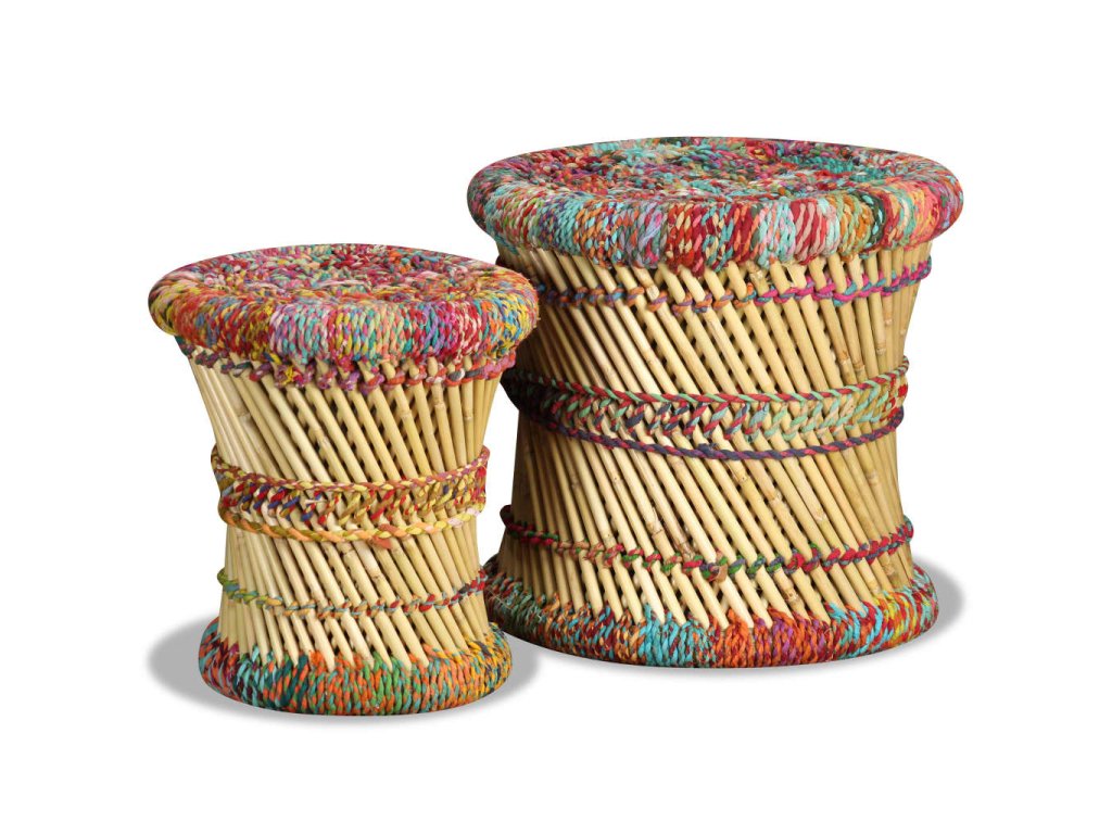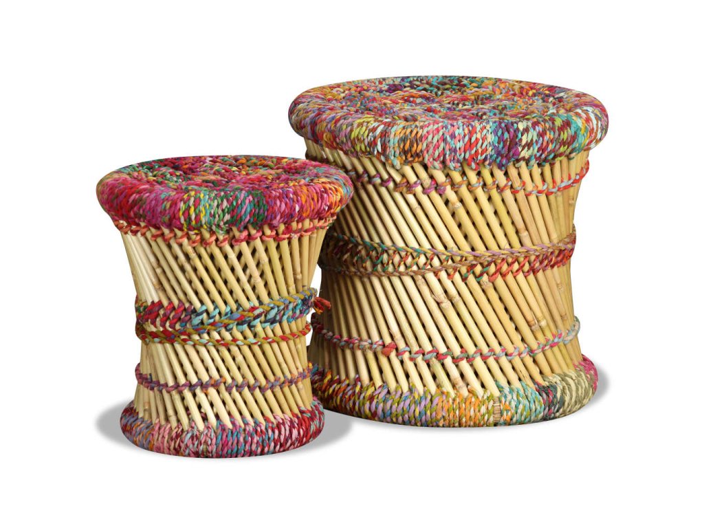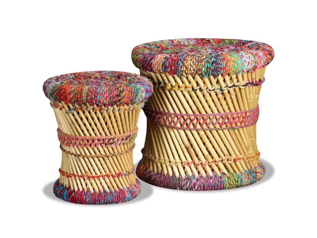 Stoličky jsou vyrobeny z bambusu, a proto vypadají velice přirozeně. Buď si na ně můžete hodit nohy po dlouhém pracovním dni, nebo je můžete použít jako odkládací stolek. Nemusíte se na ně bát vystavit dekorativní předměty, jako jsou mísy s ovocem a vázy, ale také jídlo a nápoje. Železné nožky jsou totiž stabilní a hodně toho vydrží.