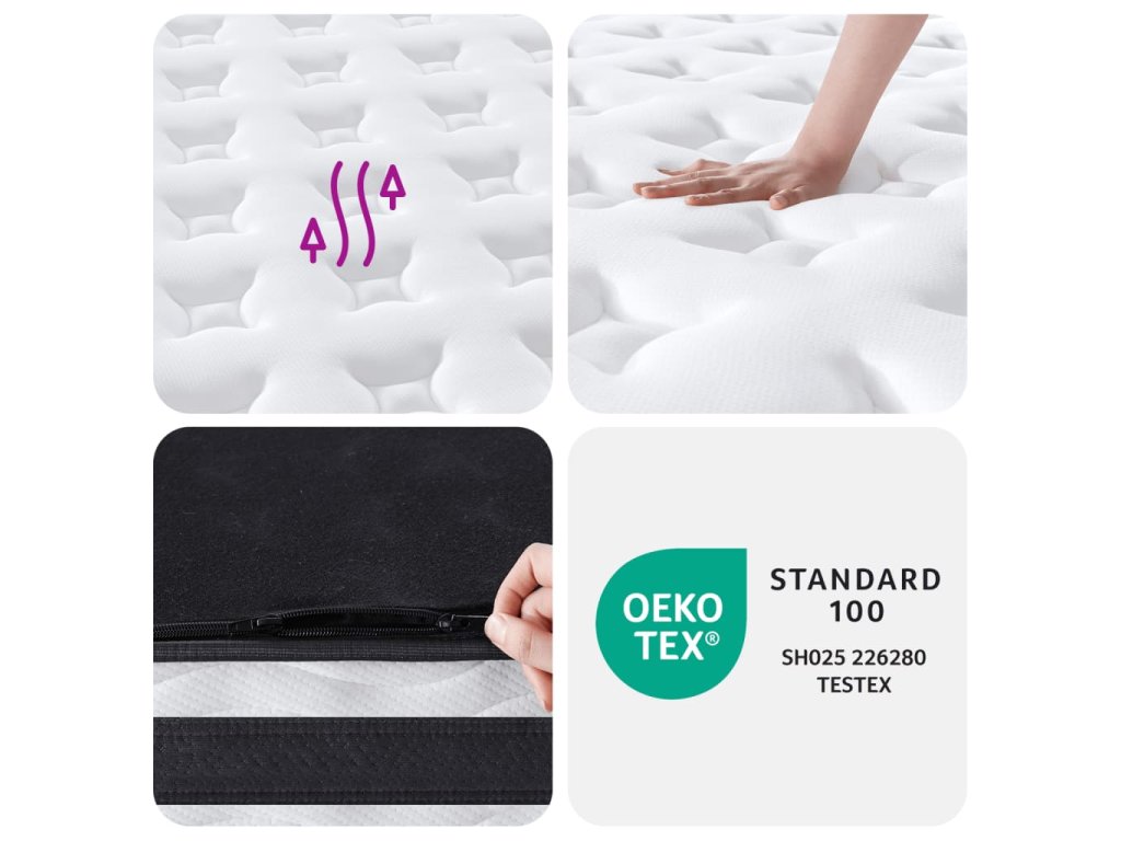 - Individuální opora: Každá spirálová pružina s látkovým povlakem reaguje na tlakové body, poskytuje cílenou oporu a rovnoměrně rozkládá tlak na páteř.