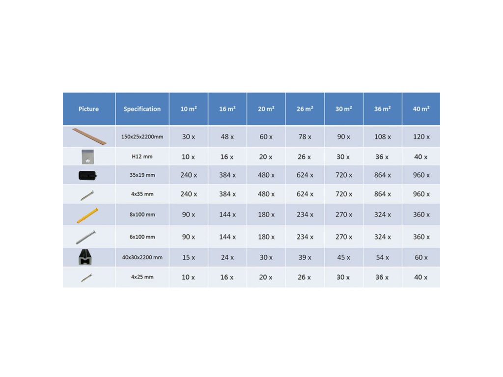 Balení obsahuje 78 podlahových prken na terasu, 26 svorek na první a poslední prkno, 624 plastových oddělovačů, 624 šroubů z nerezové oceli, 234 plastových hmoždinek pro rozpínací šrouby, 234 rozpínacích šroubů z nerezové oceli, 26 šroubů (4 x 25 mm) a 39 nosníků.