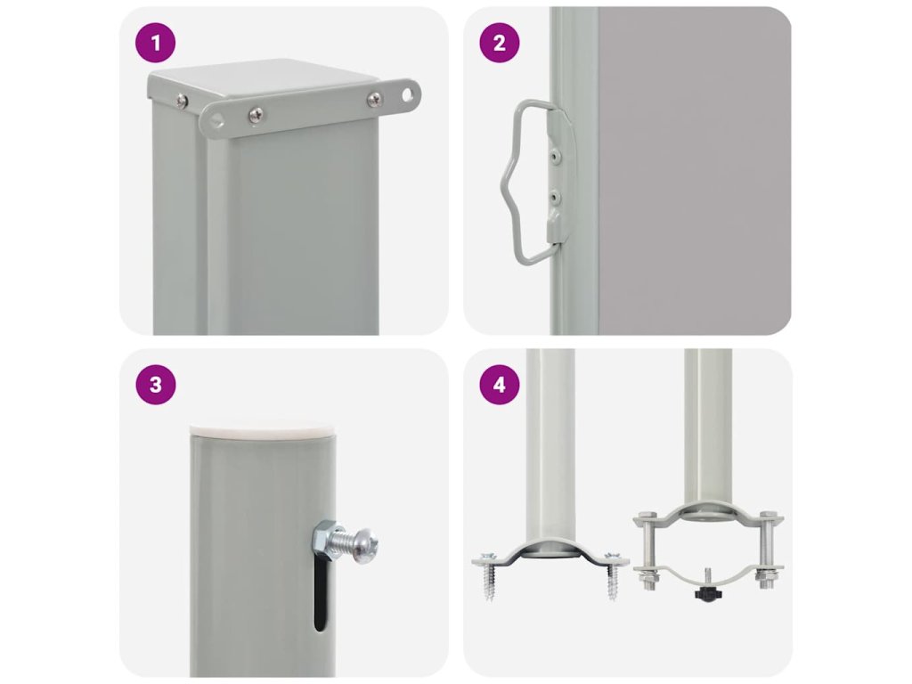 Zástěna je vyrobena z polyesteru, který je odolný proti UV záření a netrhá se. Kazeta, z níž boční markýzu snadno roztáhnete, je ve vertikální pozici posazena na bytelné železné základně. Markýza rovněž disponuje funkcí automatického srolování. Její sestavení je jednoduché.