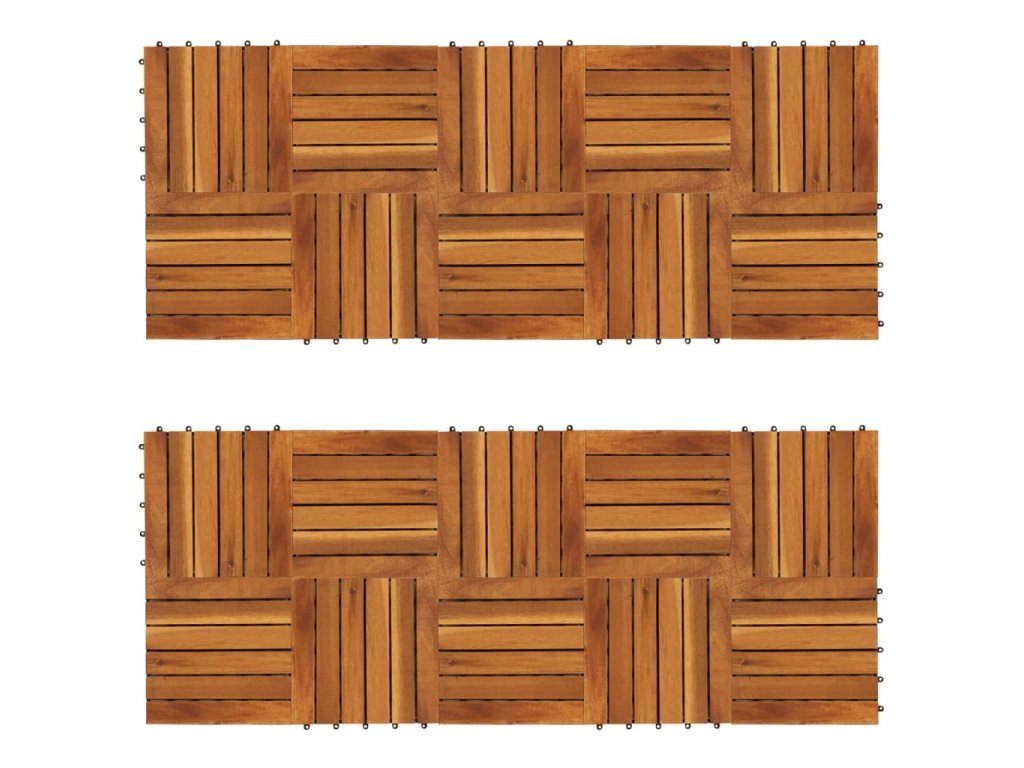 Tento set 20 ks terasových dlaždic z tvrdého dřeva se perfektně hodí pro zkrášlení povrchů nebo cestiček ve vaší zahradě, hodí se i na vaši terasu, balkon nebo do kteréhokoliv pokoje. Vzor není pouze dekorativní, ale zabraňuje také klouzání.