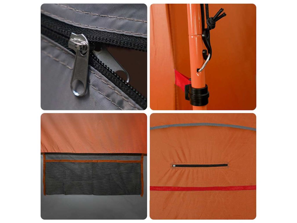 - Snadný přístup: Vchod na zip umožňuje snadný přístup. Podporuje také proudění vzduchu a zajišťuje dostatek přirozeného světla. Převlékací stan má šňůru na zavěšení oblečení a ručníků a také úložnou kapsu na drobnosti, jako jsou klíče, peněženky a telefony.