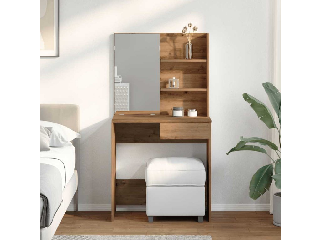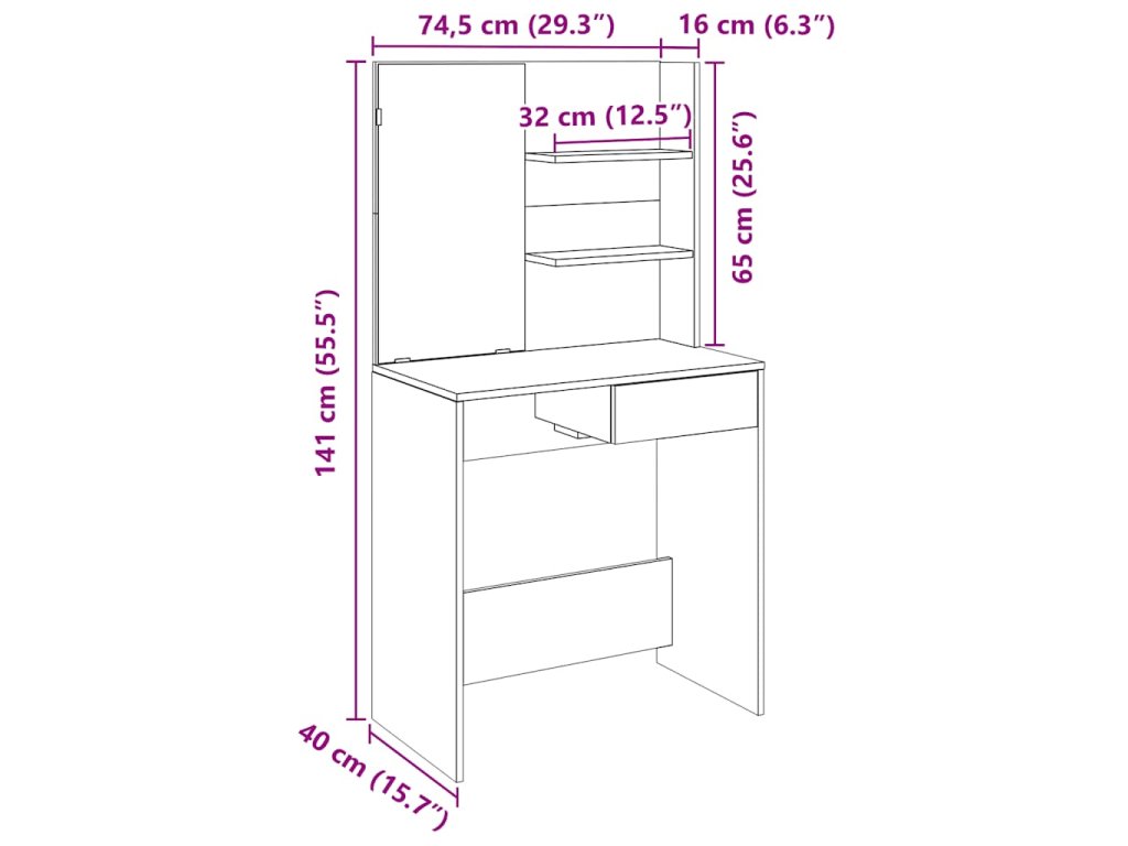 - Dostatek úložného prostoru: Toaletní deska, třípatrové police na stole a jedna zásuvka pod stolem poskytují dostatek prostoru pro snadný přístup k make-upu, šperkům a každodenním potřebám.