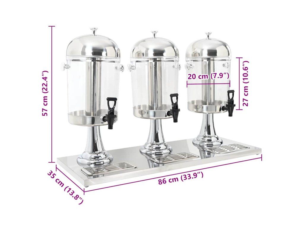 Tři dávkovače na džus mají každý kapacitu 8 litrů. Zásobník na nápoje s kohoutkem je vhodný pro sklenice o maximální výšce 15,5 cm. Centrální válec může být naplněn ledovými kostkami pro ochlazení nápojů. Odkapávací vanička shromažďuje veškerý rozlitý džus a dá se snadno vyjmout a vyprázdnit.