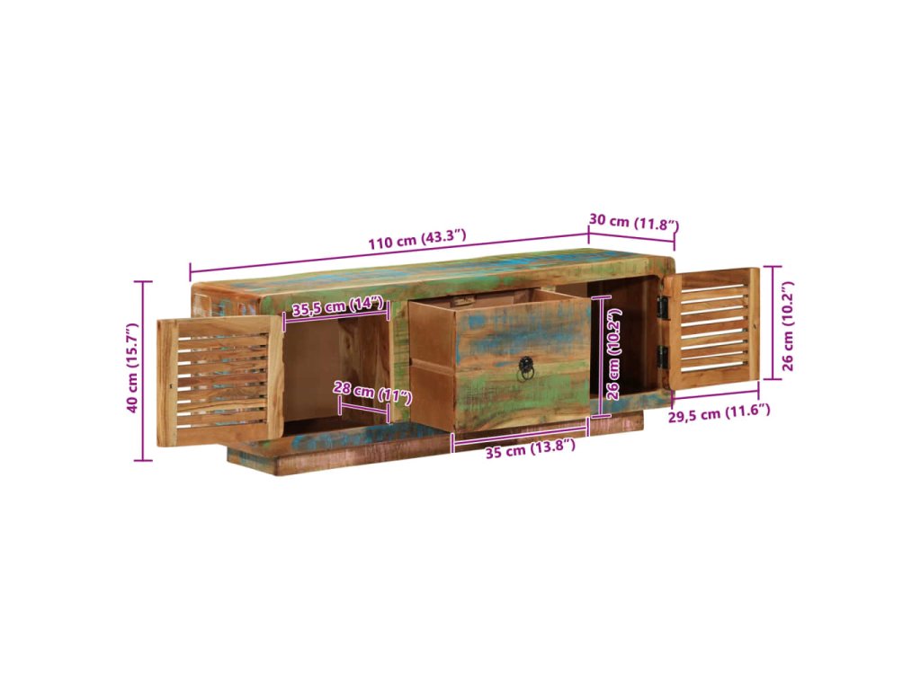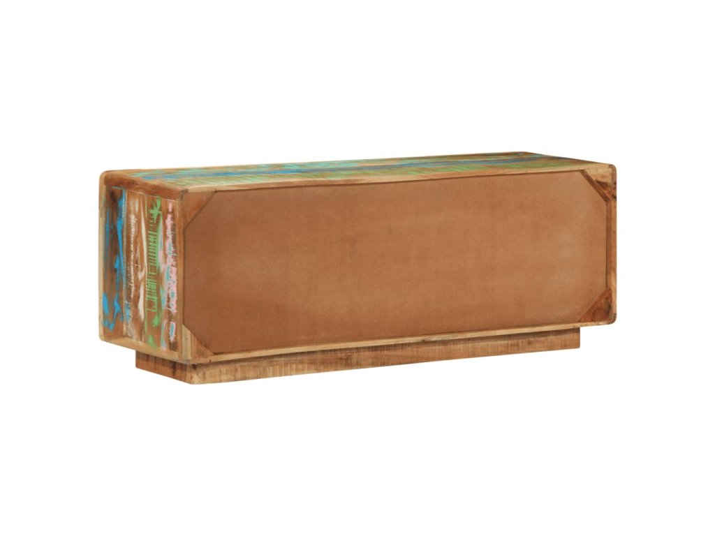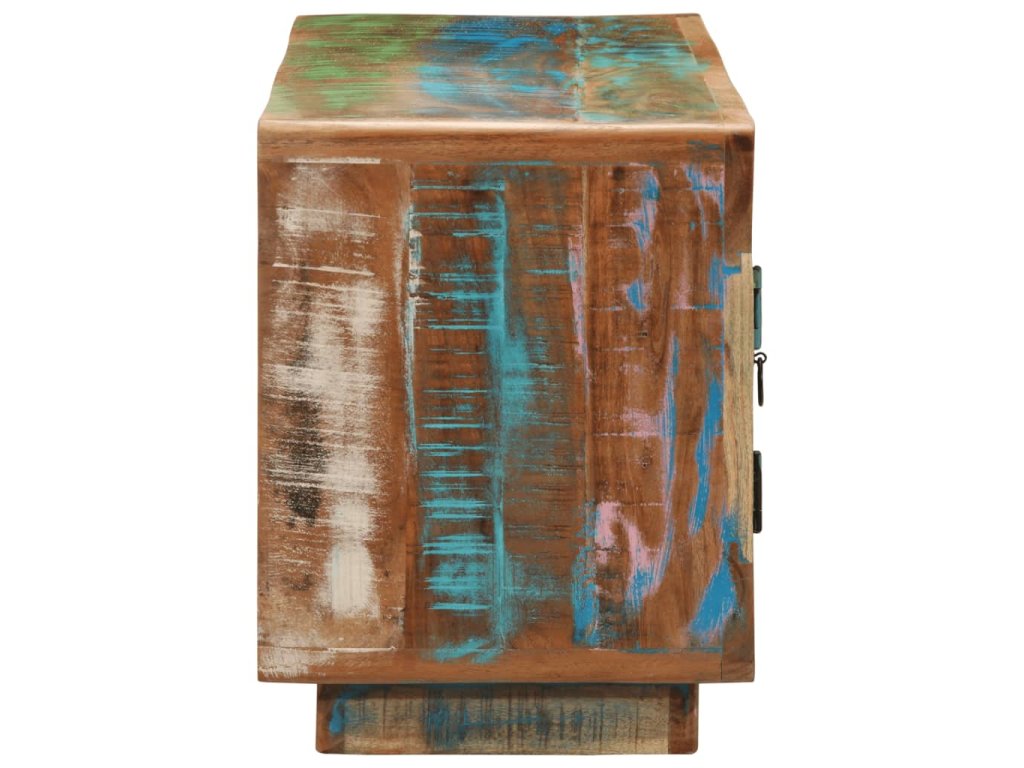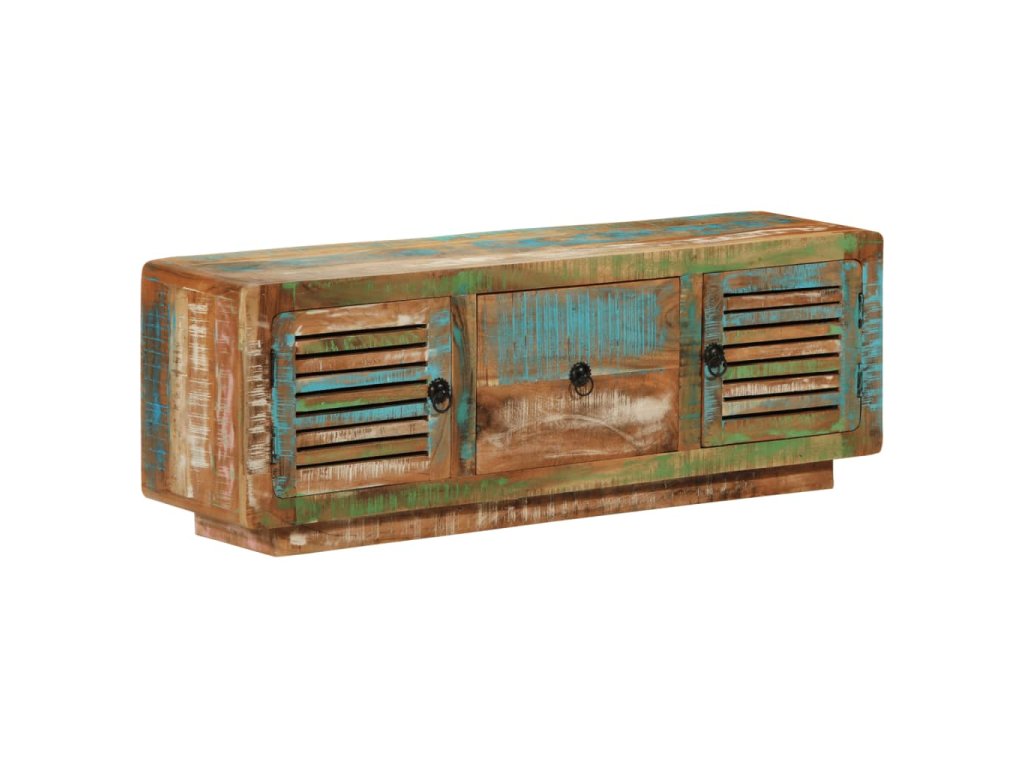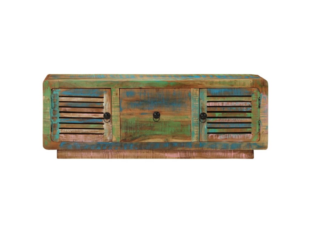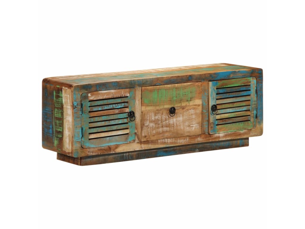 Tento dřevěný TV stolek s dvěma dvířky a zásuvkou je vyrobený z masivního recyklovaného dřeva s vícebarevnou povrchovou úpravou a do vašeho bydlení vnese působivé vintage kouzlo.