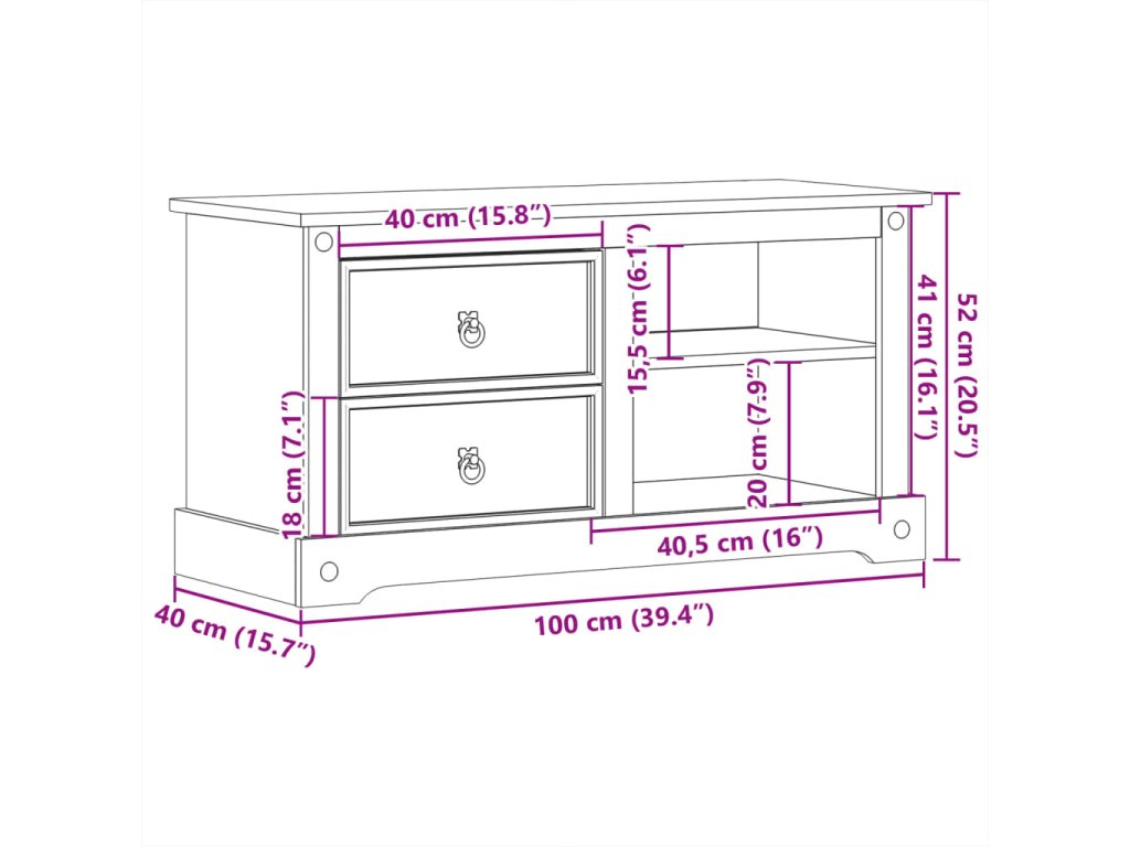 - Masivní borové dřevo: Masivní borové dřevo je krásný přírodní materiál. Borové dřevo má rovnou kresbu a obsahuje suky, které materiálu dodávají jeho charakteristický, rustikální vzhled. Televizní stolek je vyroben z masivního borového dřeva, je tedy odolný a robustní.