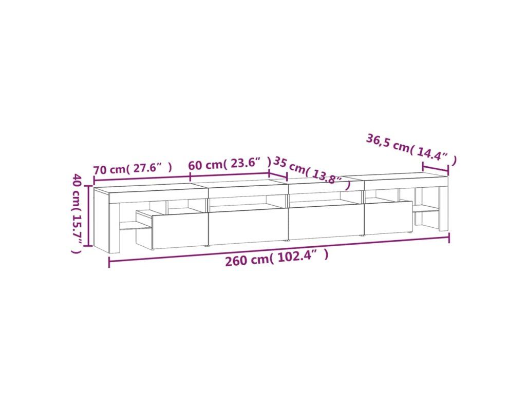 - Barevné LED osvětlení: Televizní stolek je vybavený RGB LED světly s několika různými nabídkami, které vám umožní změnit barvu světel nebo nechat světla přizpůsobit automaticky. LED osvětlení podtrhuje moderní vzhled skříňky a zdůrazňuje její trendy styl.