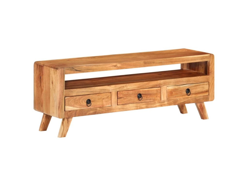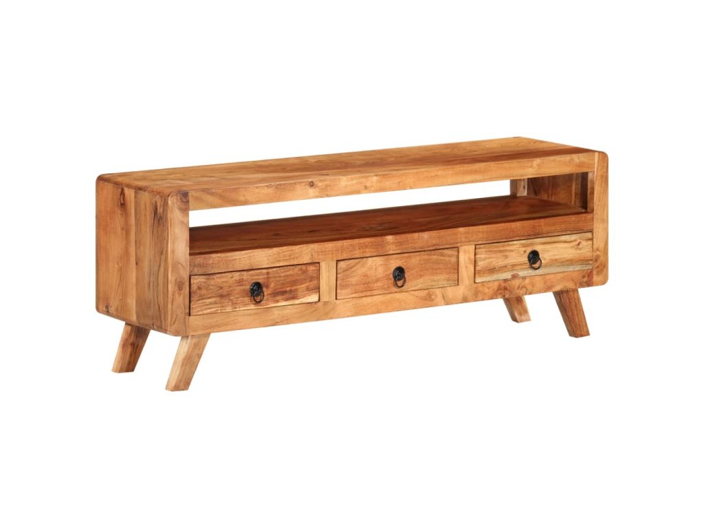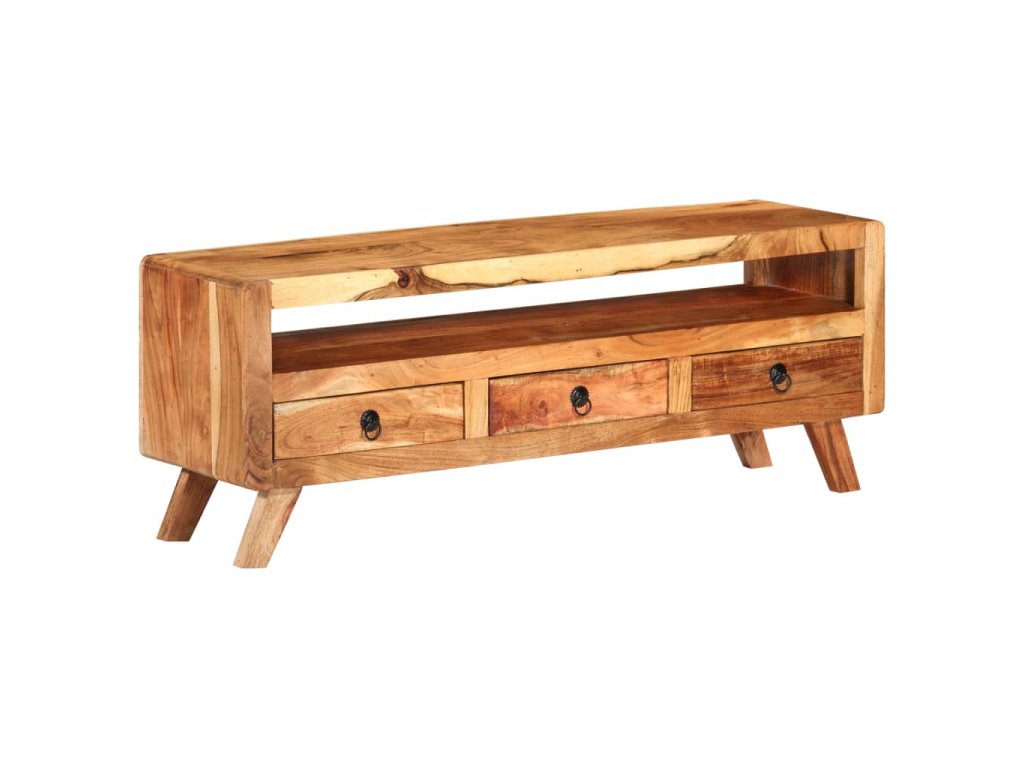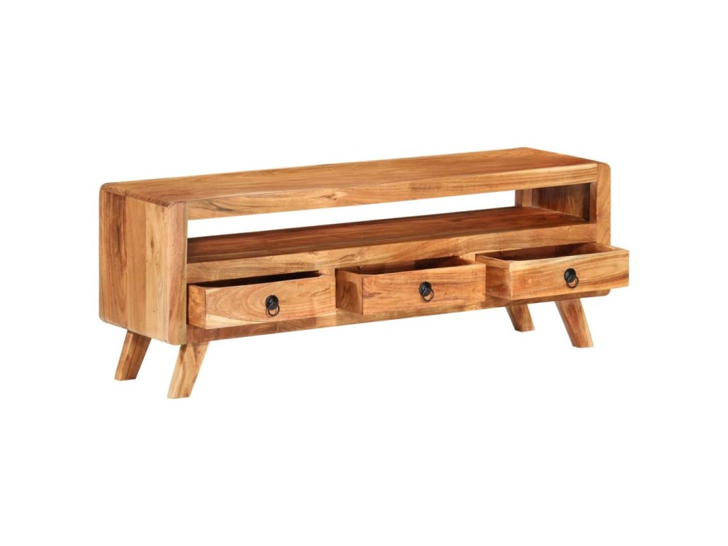 TV stolek je vyroben z masivního akáciového dřeva a je vysoce odolný a snadno se čistí. Známky opotřebení a viditelná struktura dřeva dodávají každému kusu jeho vlastní historii a jedinečný vzhled. Každý krok výrobního procesu je prováděn s největší pečlivostí, ať už jde o rekombinaci, leštění, lakování nebo voskování. Je vybaven 3 zásuvkami a 1 policí, které poskytují dostatek úložného prostoru pro vaše osobní věci.