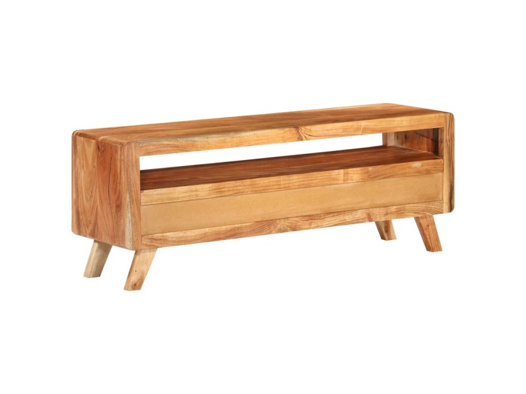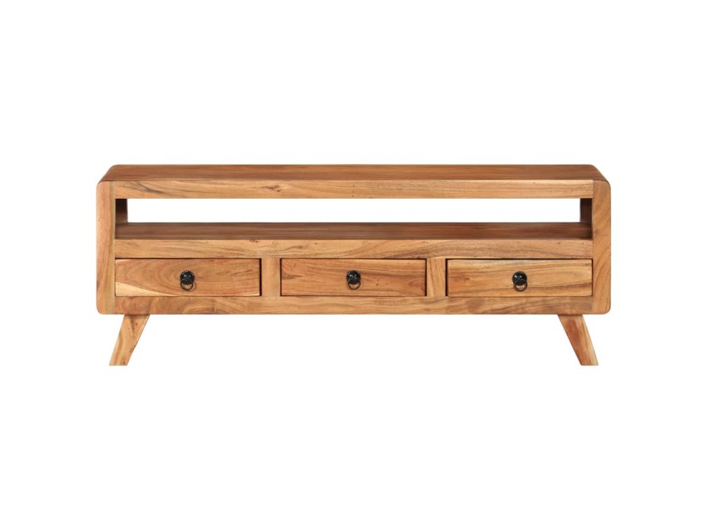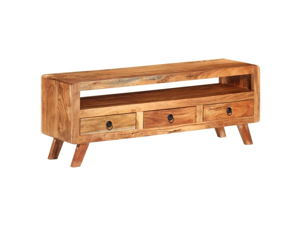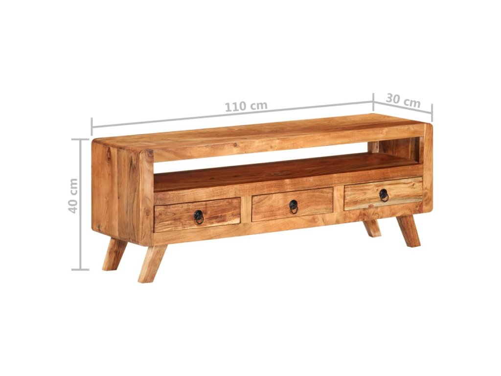 TV stolek je vyroben z masivního akáciového dřeva a je vysoce odolný a snadno se čistí. Známky opotřebení a viditelná struktura dřeva dodávají každému kusu jeho vlastní historii a jedinečný vzhled. Každý krok výrobního procesu je prováděn s největší pečlivostí, ať už jde o rekombinaci, leštění, lakování nebo voskování. Je vybaven 3 zásuvkami a 1 policí, které poskytují dostatek úložného prostoru pro vaše osobní věci.