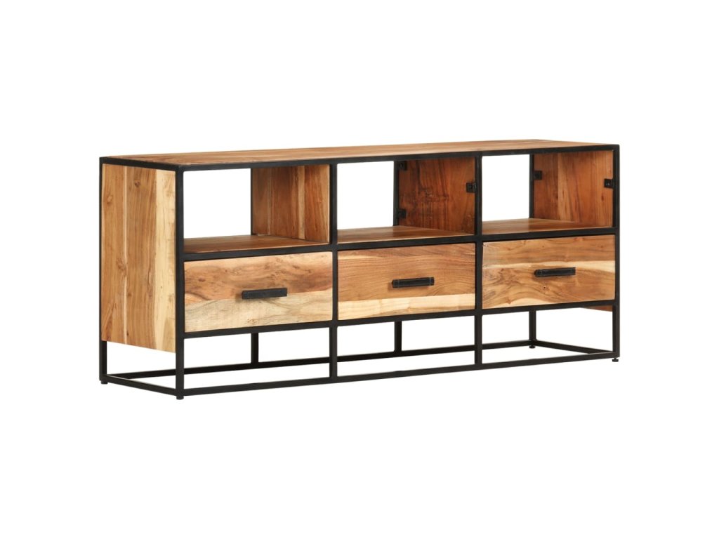 Komoda je vybavena 3 poličkami a 3 zásuvkami, ve kterých najdete dostatek prostoru pro uložení časopisů, knih a dalších drobností, které chcete mít na dosah ruky. Hi-fi skříňka je zhotovená z masivního akáciového dřeva s přírodní povrchovou úpravou a má velmi originální vzhled. Zručné řemeslné zpracování a nádherná kresba akáciového dřeva dávají každému kusu nábytku jedinečný a od všech dalších kusů mírně odlišný charakter. Železný rám s práškovým nátěrem navíc přispívá ke stabilní a robustní struktuře a industriálnímu stylu této stereo skříňky.