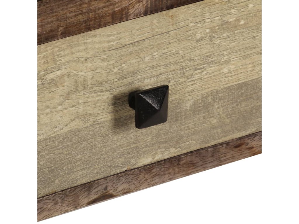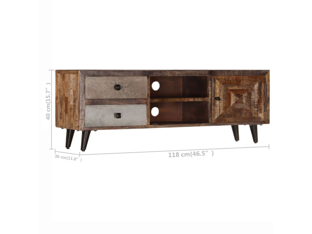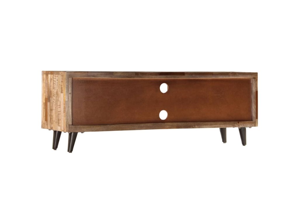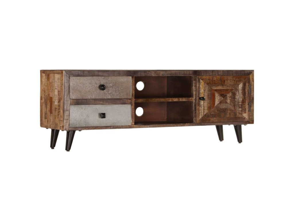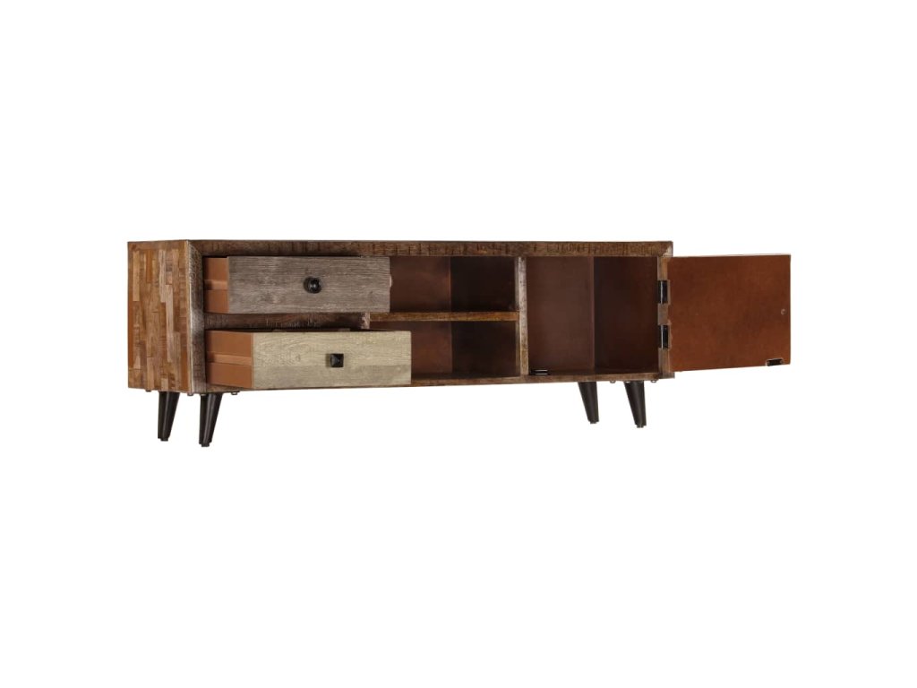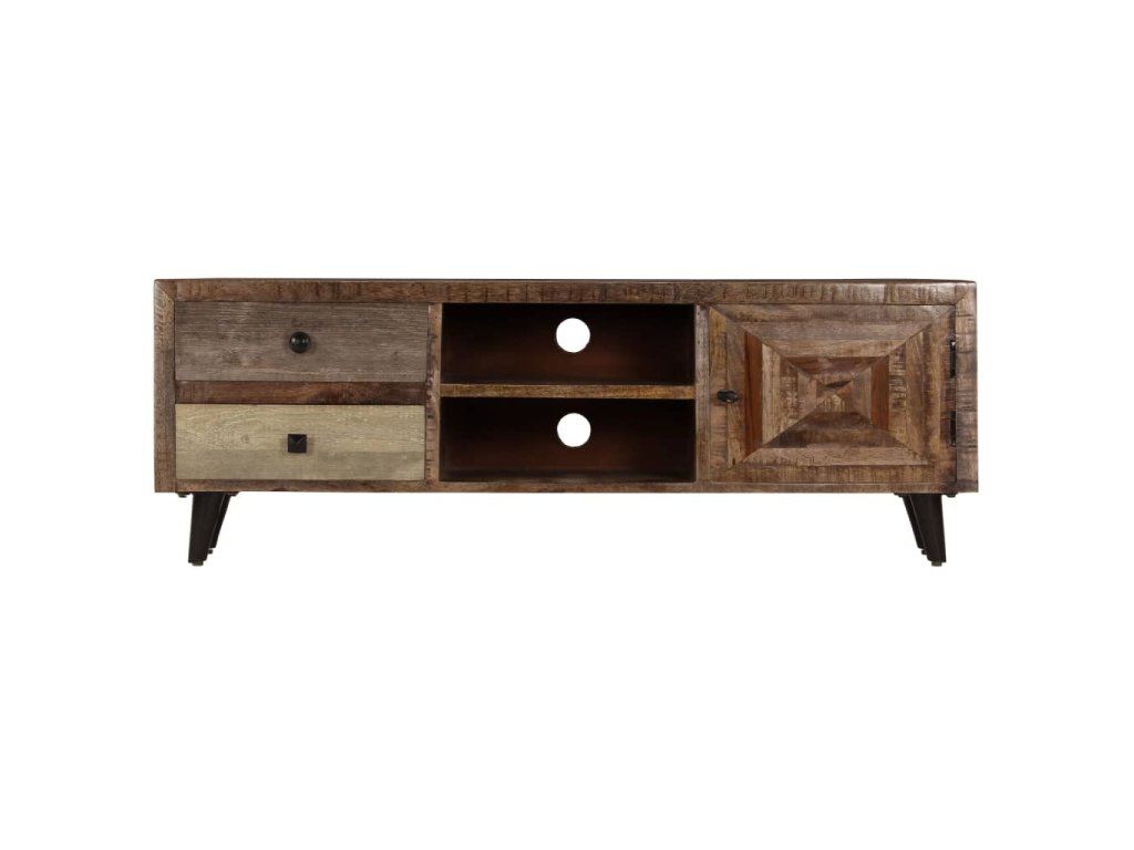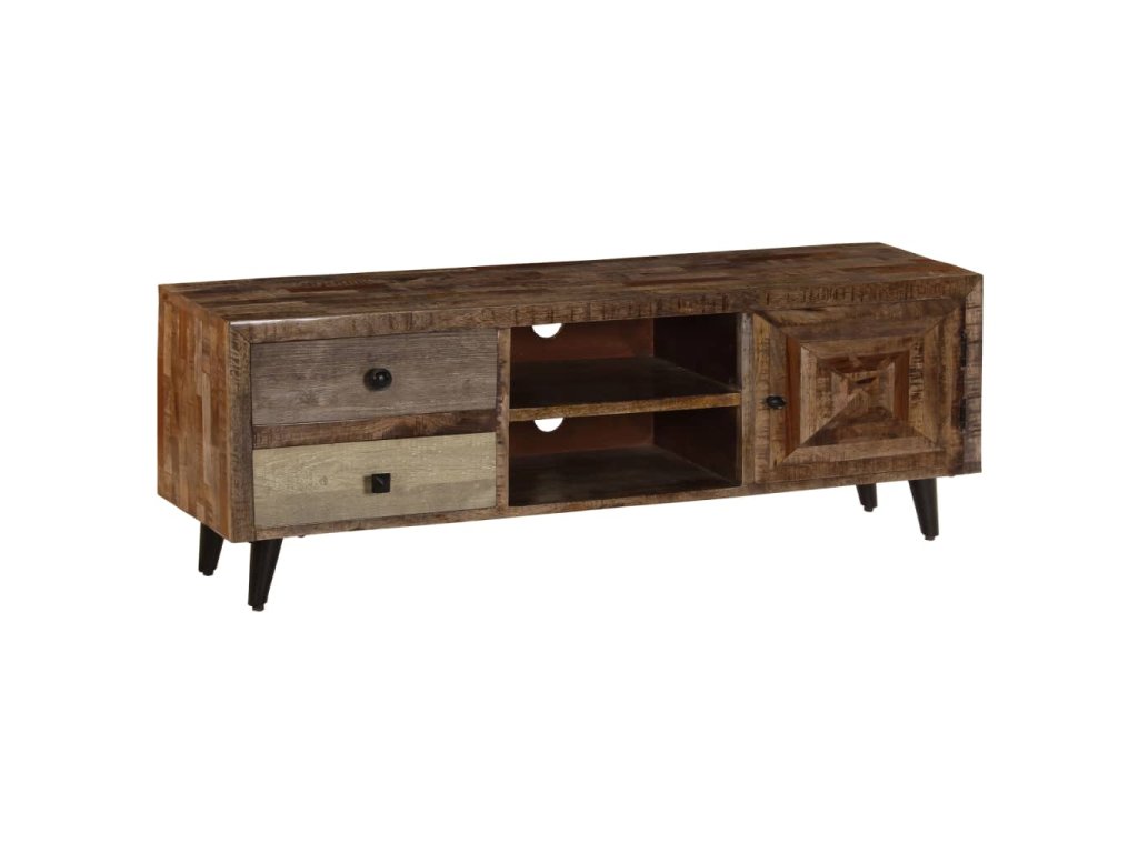 Stolek pod TV je vyroben z masivního mangovníkového dřeva, které bylo vyleštěno, natřeno a navoskováno, a jeho překrásná povrchová úprava mu propůjčuje rafinovaný vzhled. Skříňka je celá ručně vyrobená a nádherná kresba dřeva činí každou z nich zcela jedinečnou a lehce odlišnou od ostatních. Televizní stolek disponuje 2 přihrádkami, 2 zásuvkami a jednou skříňkou, jež vám poskytnou spoustu místa, kam si můžete uložit svá multimediální zařízení, knížky a další věci. Sestavení výrobku je snadné.