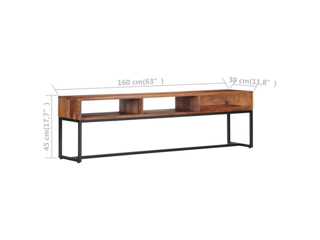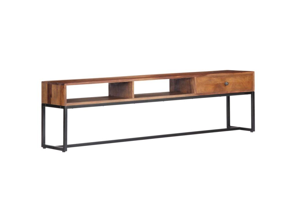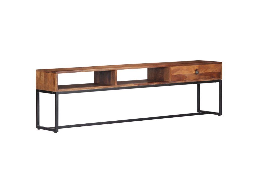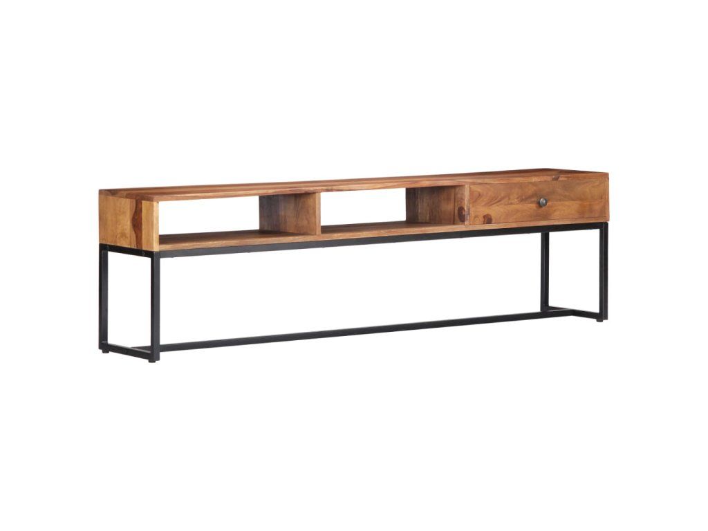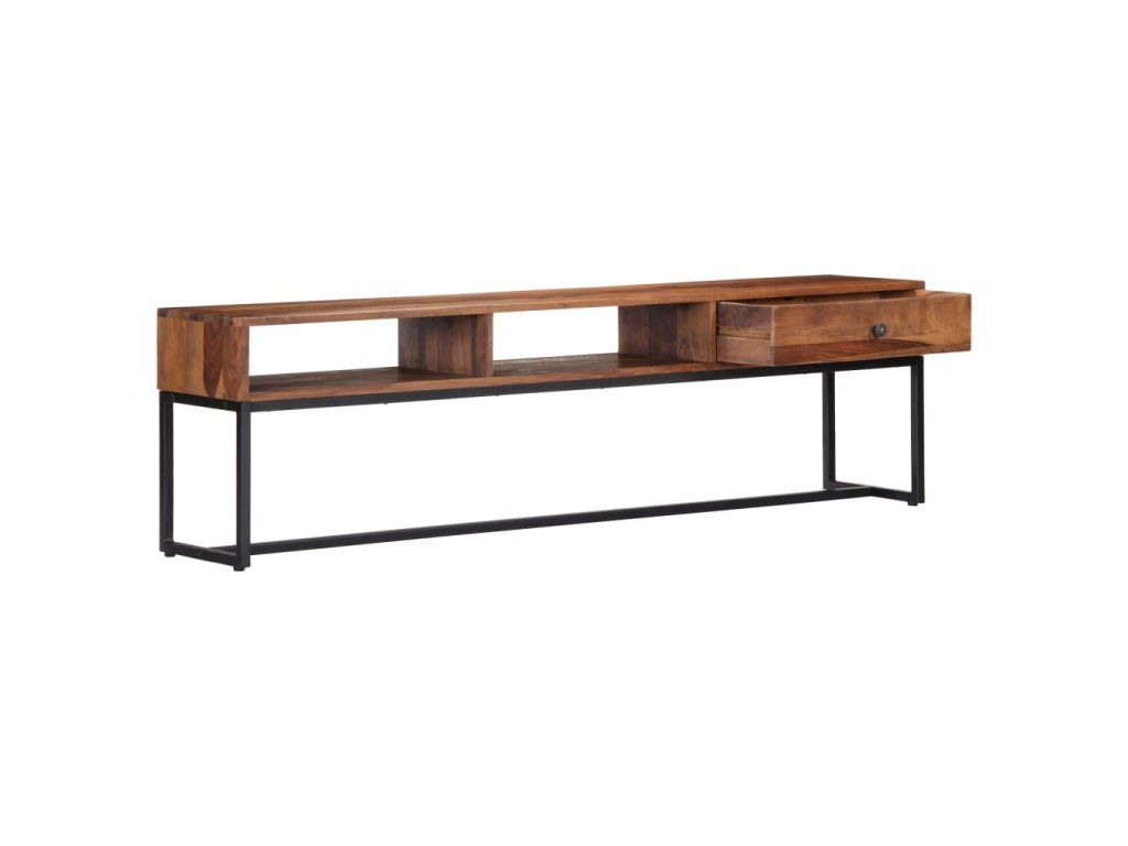 TV stolek ve vintage stylu je vyrobený z masivního akáciového dřeva a je ideálním nadčasovým doplňkem do vašeho domova. Akácie, jemuž se někdy také říká rosewood nebo palisandr, je tropické tvrdé dřevo proslulé svou bohatou texturou. Každá fáze výrobního procesu je prováděna s mimořádnou péčí, ať už se jedná o leštění, natírání nebo lakování. Pevný ocelový rám zajišťuje výtečnou stabilitu a odolnost stolku. Televizní skříňka disponuje zásuvkou, kam si můžete uložit nejrůznější drobnosti, a otevřenými přihrádkami pro uložení multimediálních zařízení, herních konzolí a časopisů.