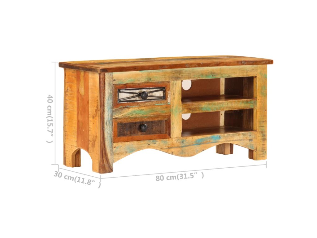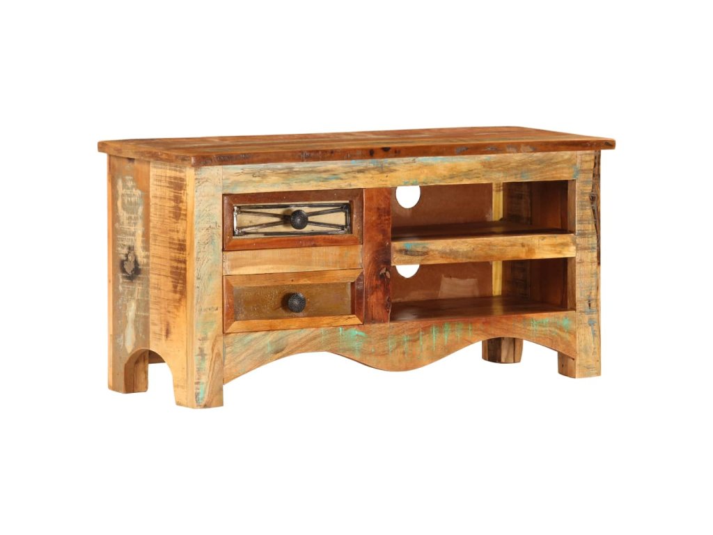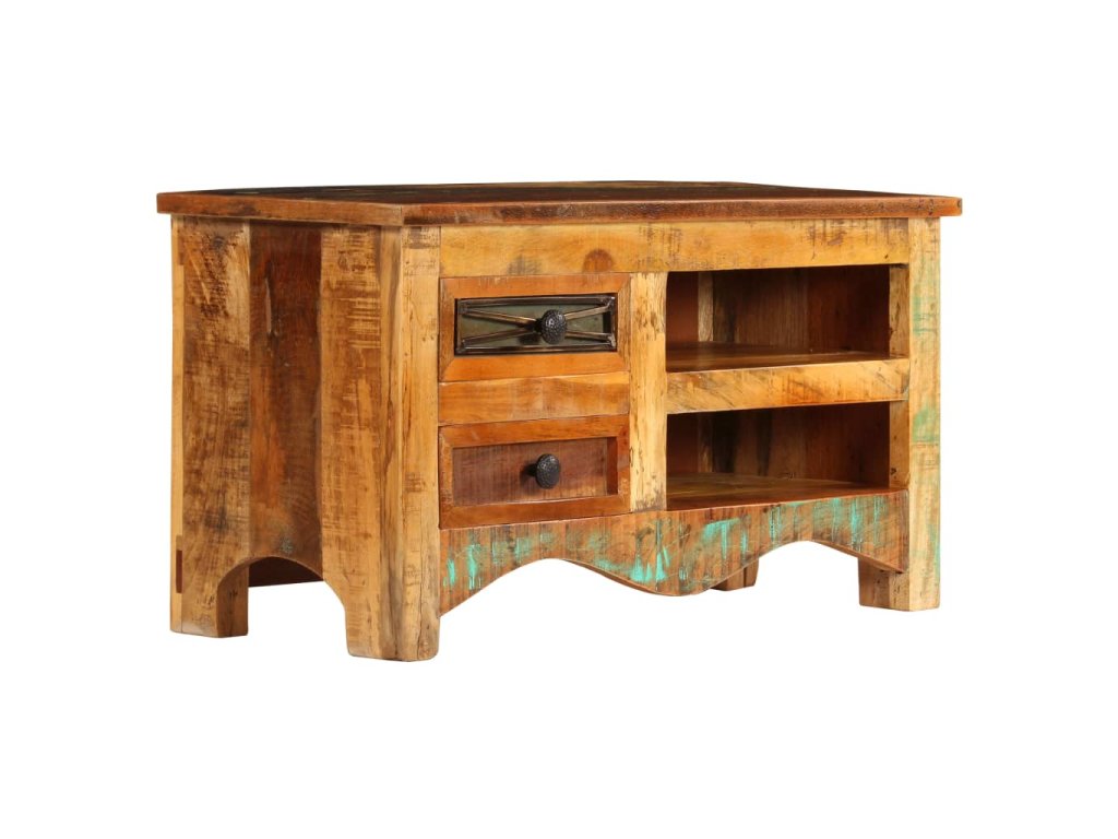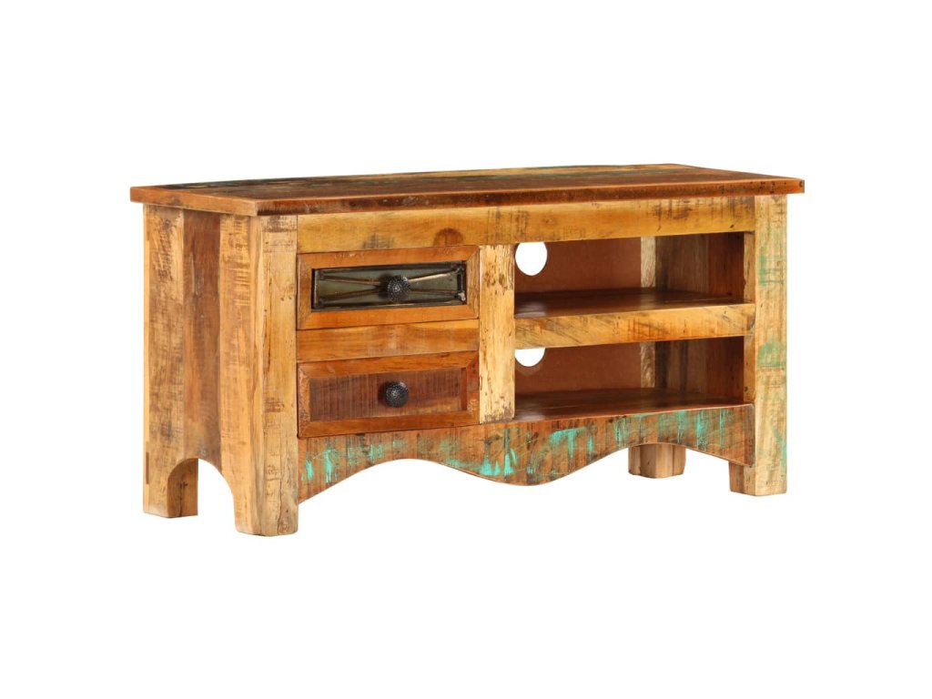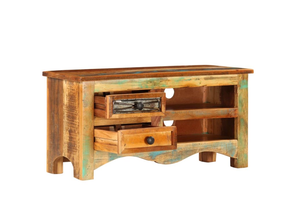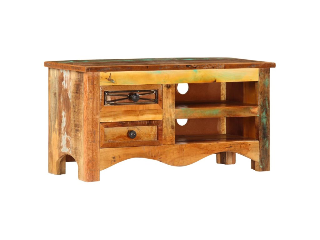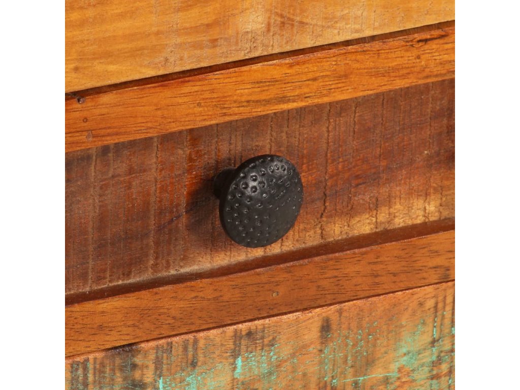Hi-Fi skříňka je vyrobená z masivního recyklovaného dřeva, které pochází z trámů, podlah a podpěrných nosníků ze starých budov určených k demolici. Sestává tedy z různých druhů dřeva, jako jsou borovice, teak, buk, dub, cedr, mangovník, akácie apod. Recyklované dřevo tak nabývá vlastností všech těchto rozličných typů dřevin. Navíc je již zestárlé, ošlehané a vyschlé, takže se nesmršťuje ani neohýbá. Nízká skříňka je celá ručně vyrobená a jemná kresba dřeva ji činí naprosto jedinečnou a lehce odlišnou od všech ostatních. Kovové prvky dodávají televiznímu stolku industriální nádech. Skříňka disponuje 2 zásuvkami a 2 přihrádkami, jež vám poskytnou spoustu místa, kam si můžete uložit svá multimediální zařízení, knížky a další věci.