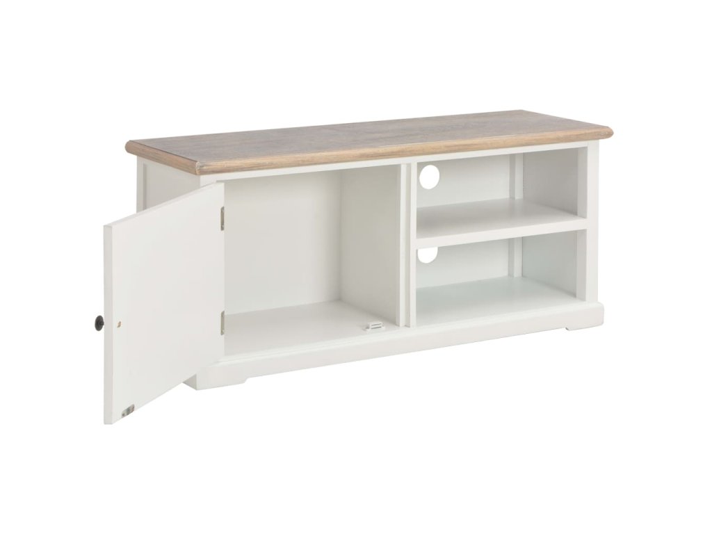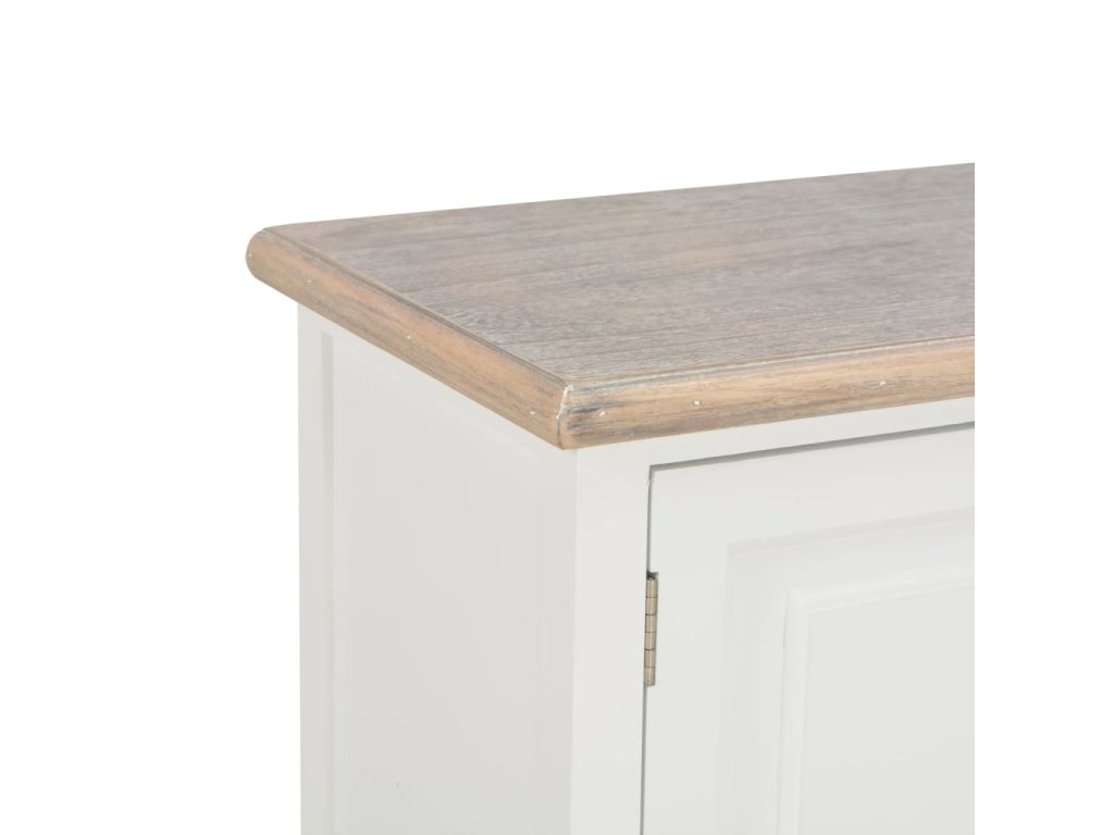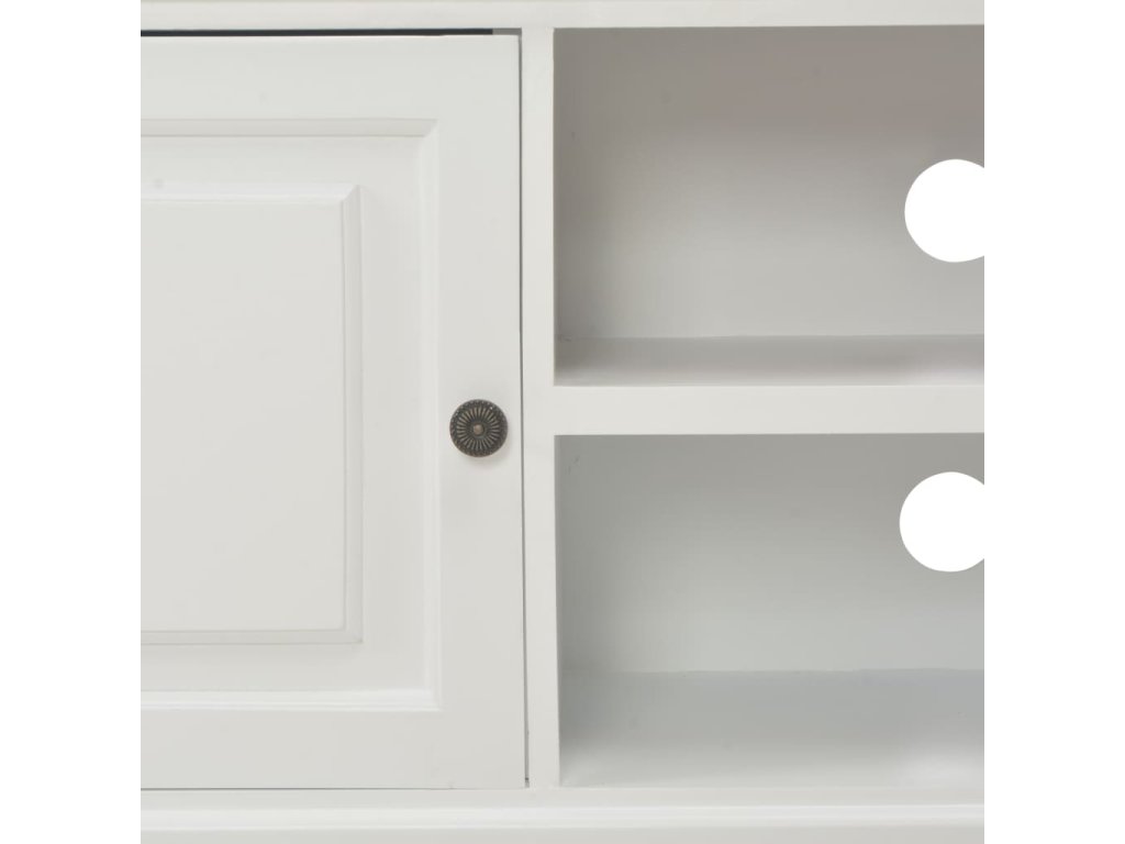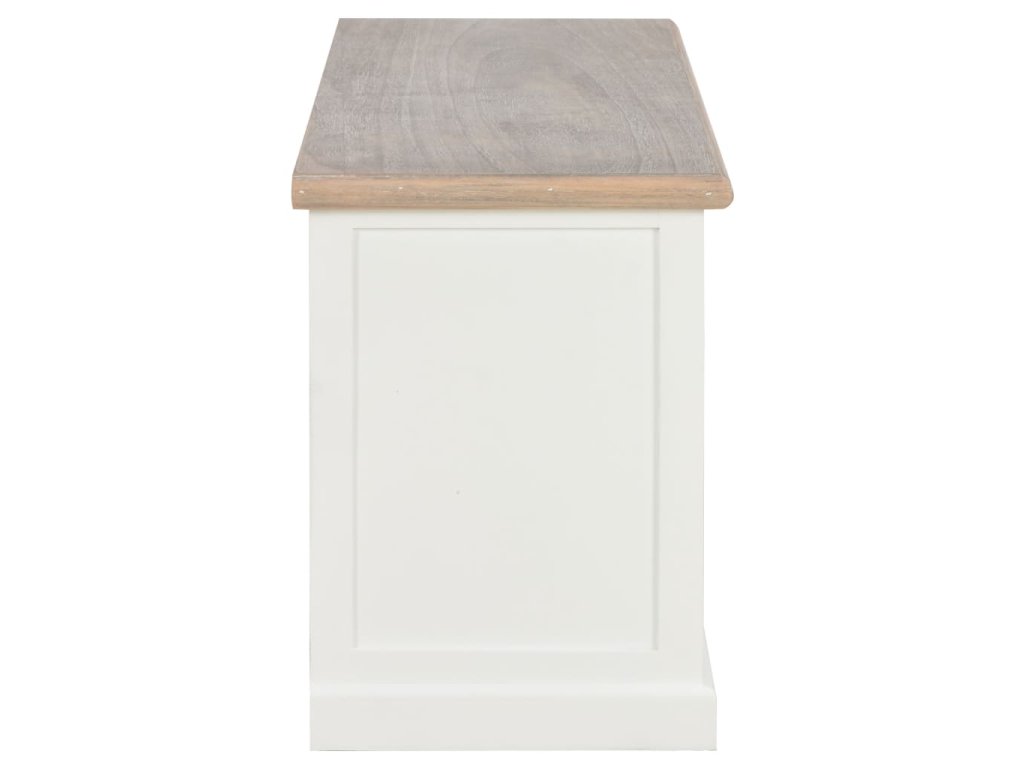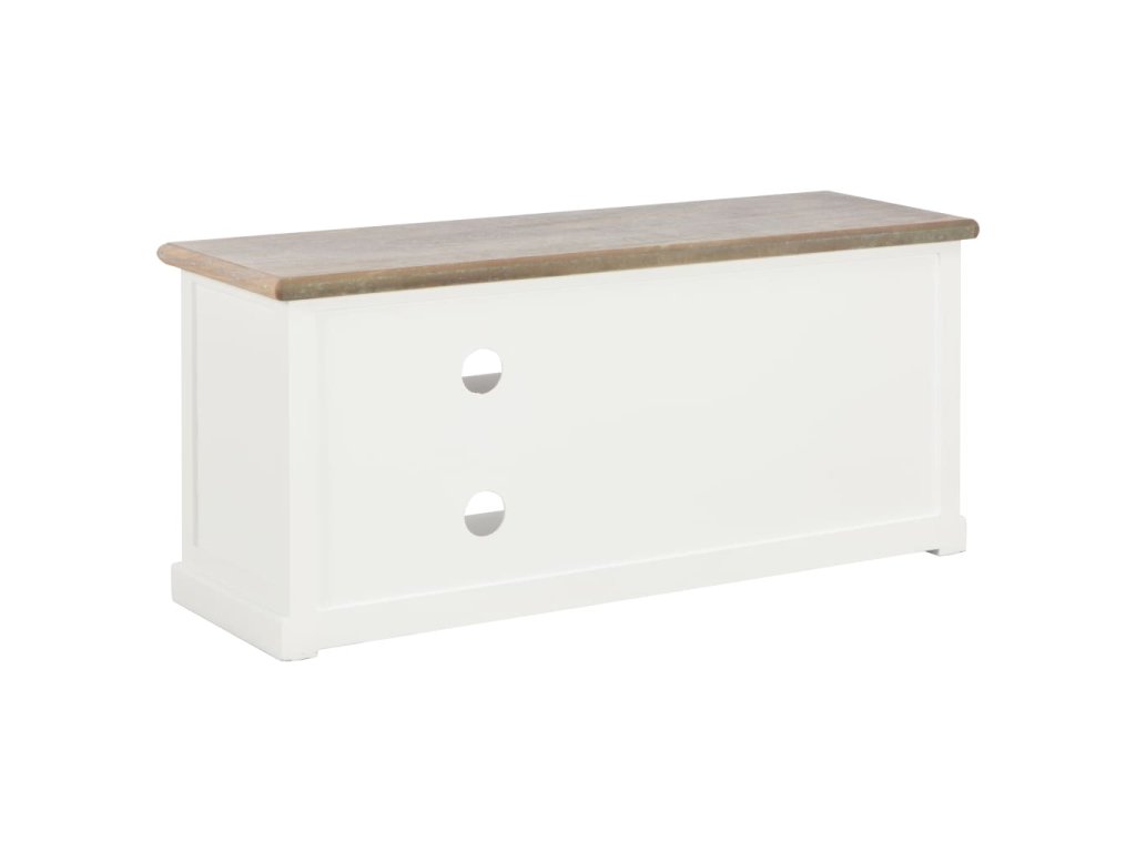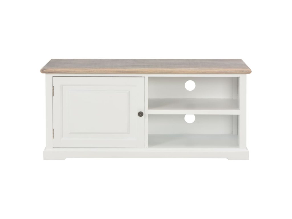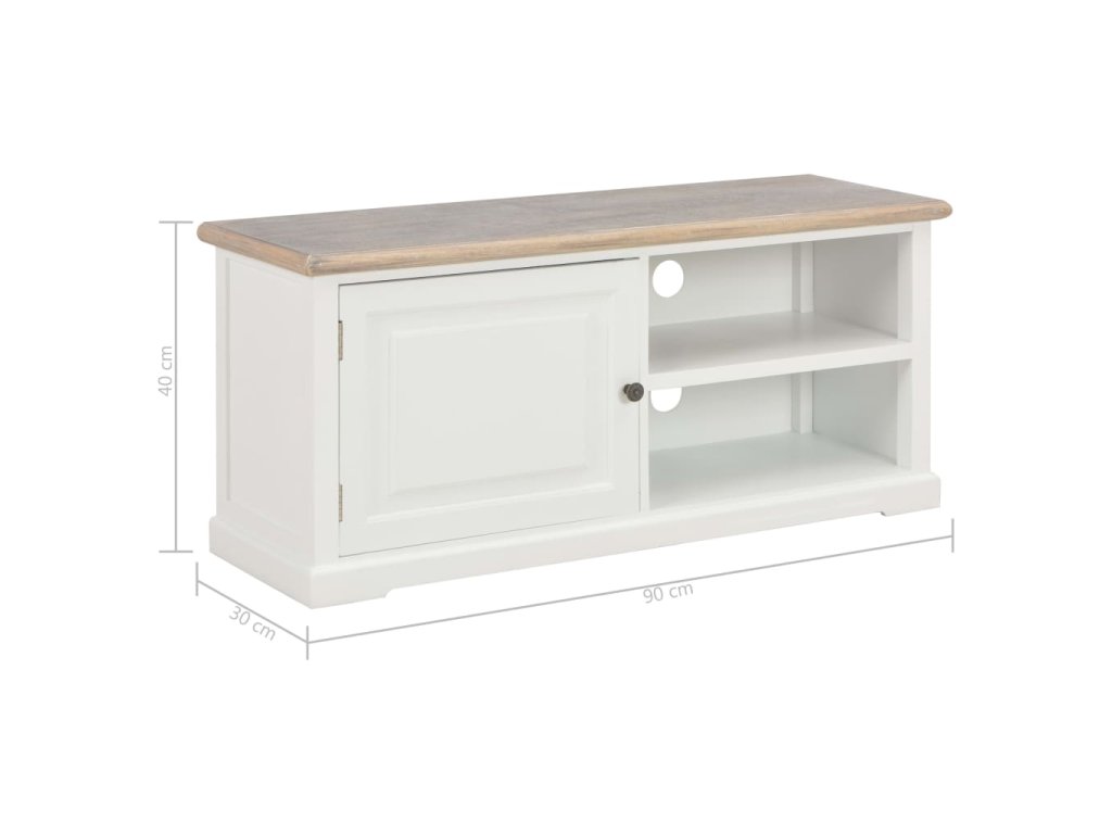 TV stolek je vyroben z MDF a masivního dřeva paulovnie, je vybaven 1 skříňkou s dvířky a 2 otevřenými přihrádkami, do kterých si můžete uložit nejrůznější předměty, jako jsou multimediální zařízení, herní konzole, časopisy apod. Veškeré kabely můžete úhledně protáhnout 2 otvory na kabely, aby nebyly vidět. Sestavení našeho HiFi stolku je snadné.