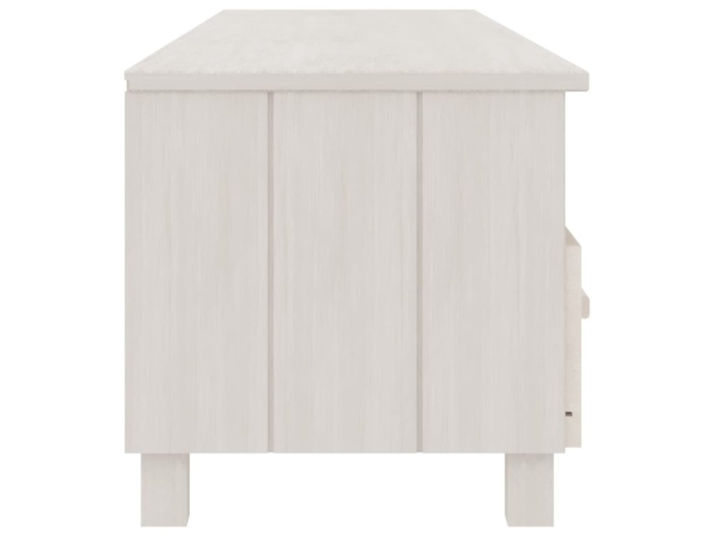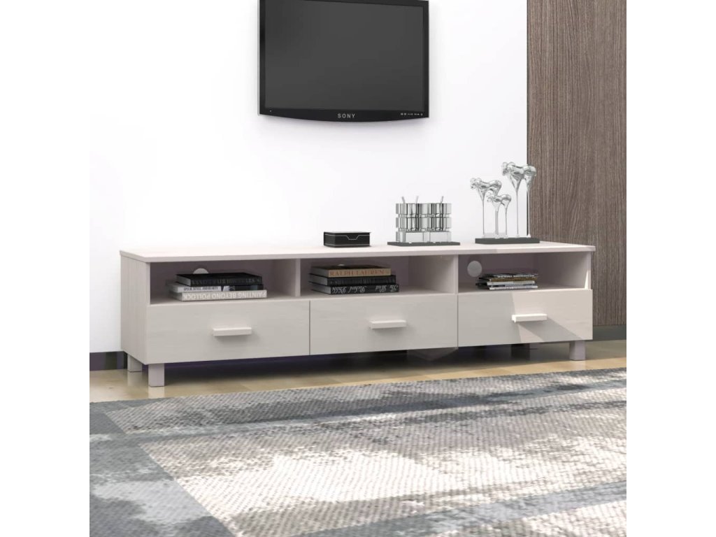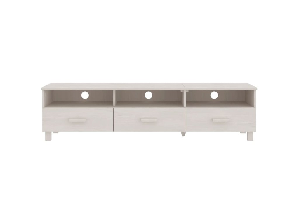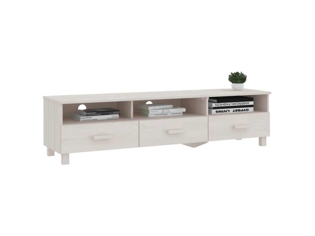 TV stolek je vyrobený z masivního borového dřeva, je tedy stabilní a odolný. TV skříňka obsahuje 3 hladce výsuvné zásuvky a 3 přihrádky, poskytne vám tedy spoustu místa k přehlednému uspořádání vašich multimediálních zařízení, knih a dalších věcí, které tak budete mít neustále po ruce. Robustní stolní deska se skvěle hodí k vystavení dekorativních předmětů, zarámovaných fotografií a pokojových rostlin. Vzadu je navíc otvor, takže můžete kabely schovat za skříňku, abyste je neměli zbytečně na očích.